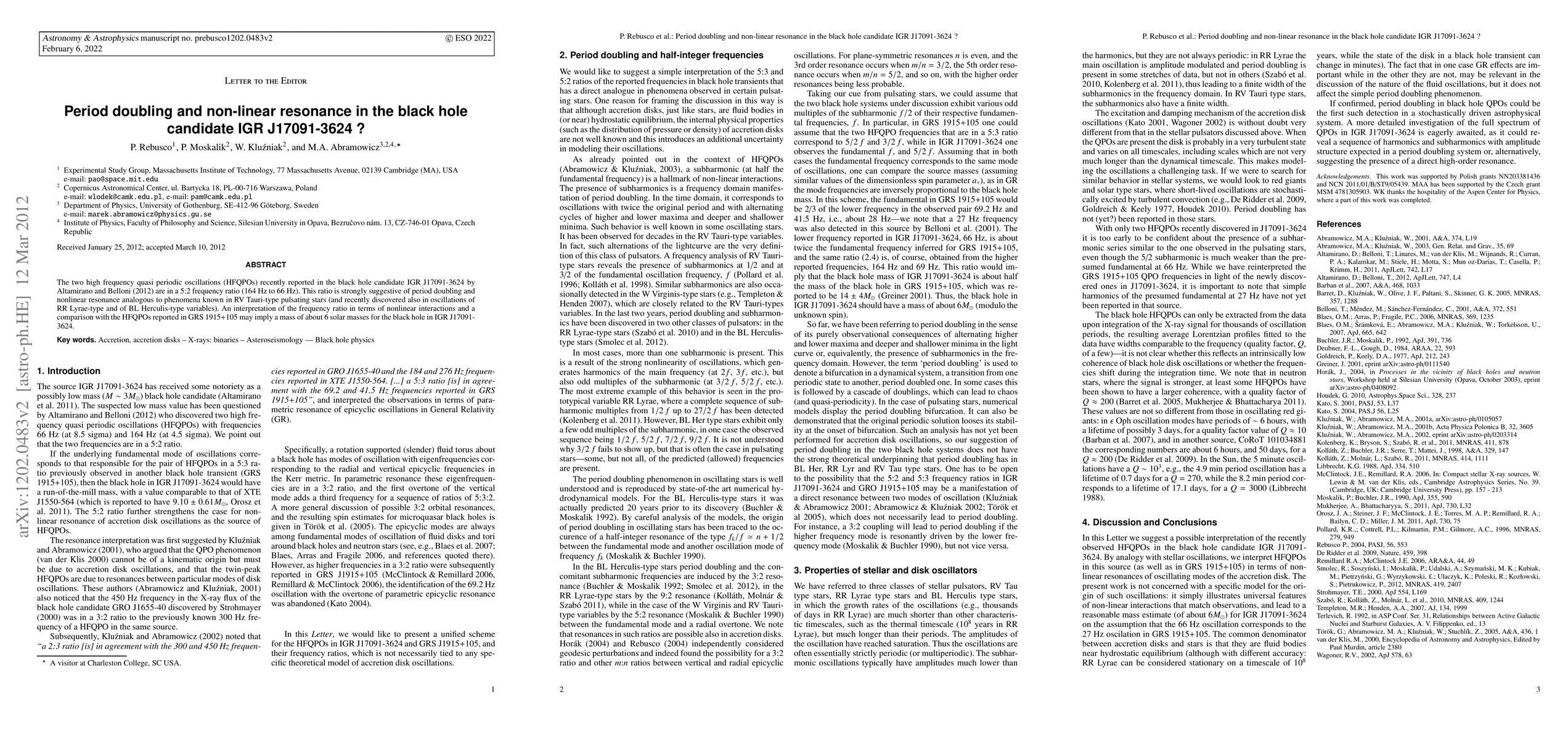 The two high frequency quasi periodic oscillations (HFQPOs) recently reported in the black hole candidate IGR J17091-3624 by Altamirano and Belloni (2012) are in a 5:2 frequency ratio (164 Hz to 66 Hz). This ratio is strongly suggestive of period doubling and nonlinear resonance analogous to phenomena known in RV Tauri-type pulsating stars (and recently discovered also in oscillations of RR Lyrae-type and of BL Herculis-type variables). An interpretation of the frequency ratio in terms of nonlinear interactions and a comparison with the HFQPOs reported in GRS 1915+105 may imply a mass of about 6 solar masses for the black hole in IGR J17091- 3624.