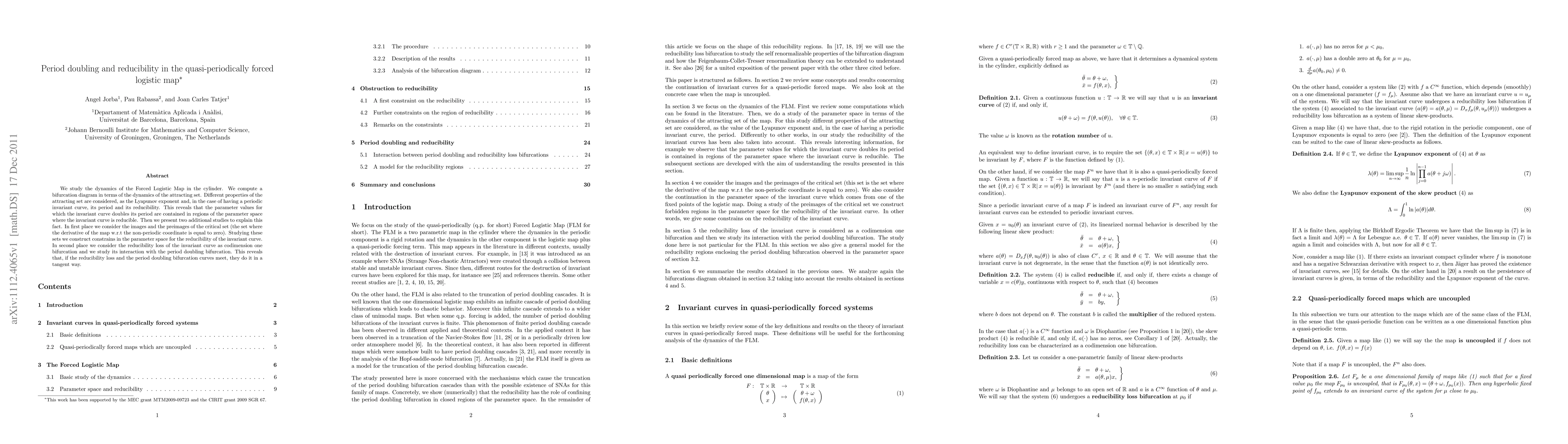 This paper investigates the dynamics of the quasi-periodically forced logistic map, focusing on period doubling and reducibility of invariant curves. It finds that parameter values leading to period doubling coincide with regions where the invariant curve is reducible, and further studies reveal a tangent interaction between reducibility loss and period doubling bifurcations.