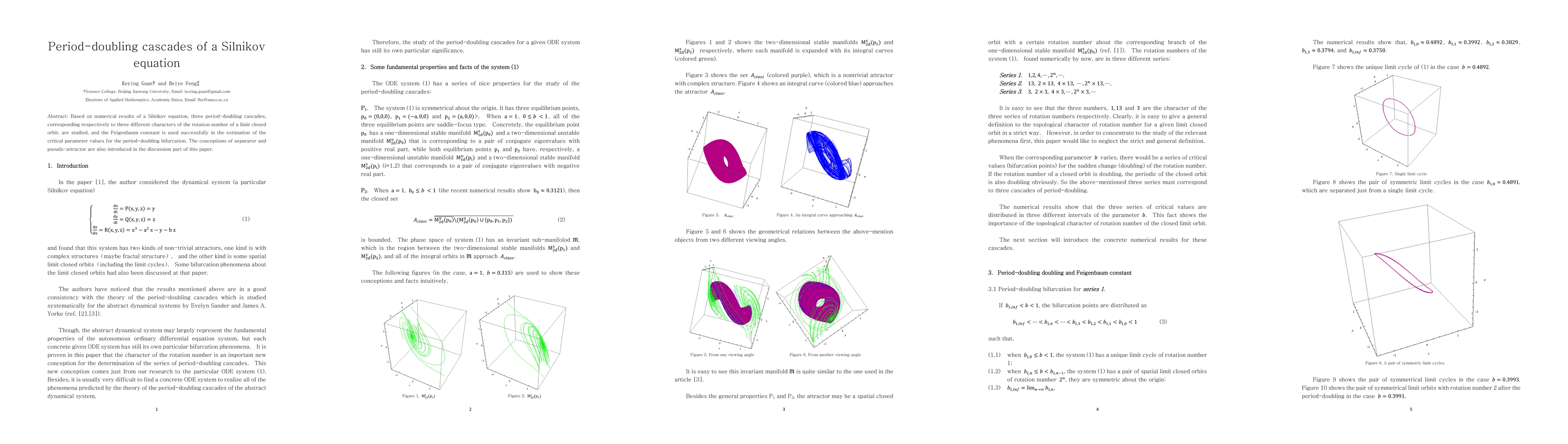 Based on numerical results of a Silnikov equation, three period-doubling cascades, corresponding respectively to three different characters of the rotation number of a limit closed orbit, are studied, and the Feigenbaum constant is used successfully in the estimation of the critical parameter values for the period-doubling bifurcation. The conceptions of separaror and pseudo-attractor are also introduced in the discussion part of this paper.