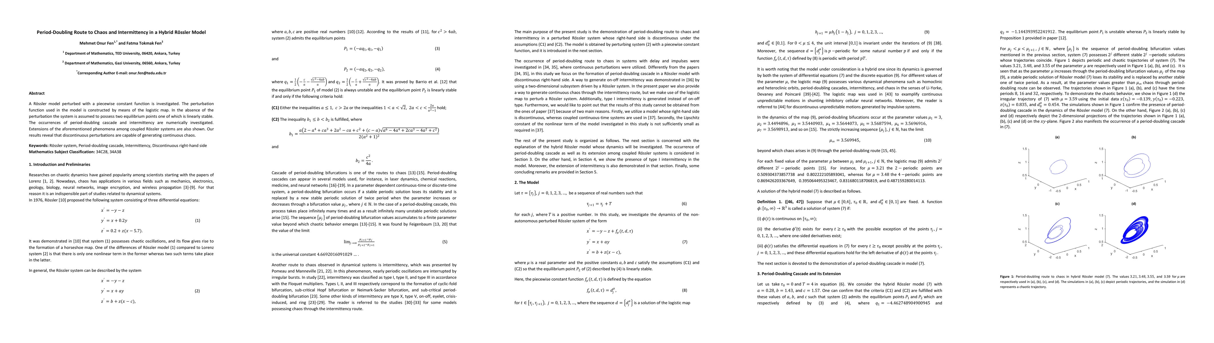 The research investigates a hybrid Rössler model perturbed with a piecewise constant function derived from the logistic map. It numerically explores period-doubling cascade and intermittency phenomena in the system and extends these findings to coupled Rössler systems.