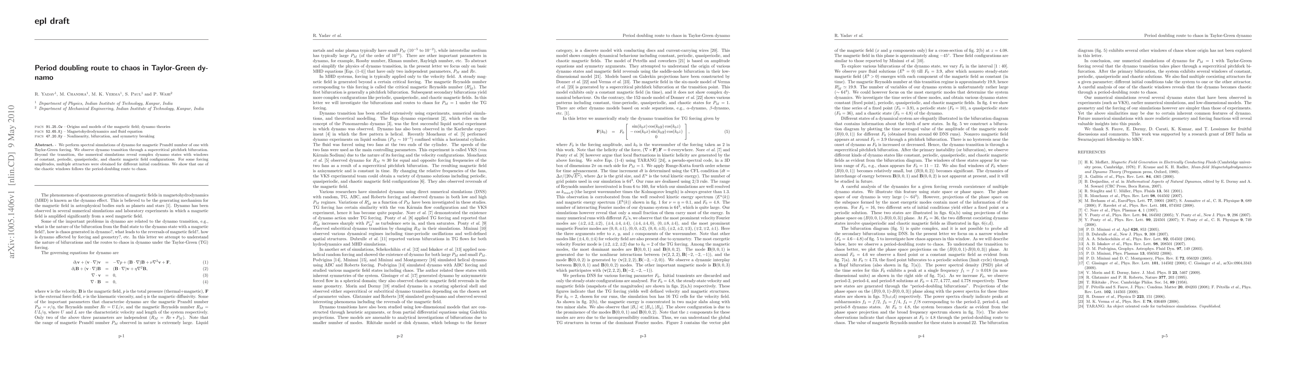 This study investigates the Taylor-Green dynamo's transition to chaos, revealing a supercritical pitchfork bifurcation and complex magnetic field states, including windows of periodic, quasiperiodic, and chaotic behavior, with evidence of period-doubling route to chaos in one chaotic window. Multiple attractors were found for varying initial conditions at specific forcing amplitudes.