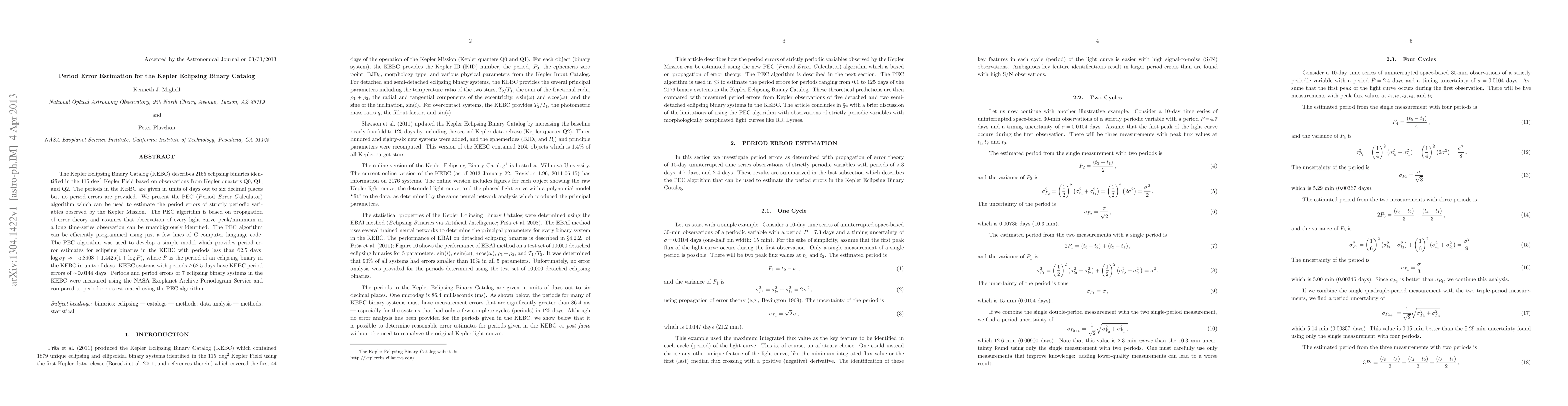 The paper introduces the PEC algorithm to estimate period errors for eclipsing binaries in the Kepler Eclipsing Binary Catalog, providing a model for periods less than 62.5 days and comparing results with NASA Exoplanet Archive data.