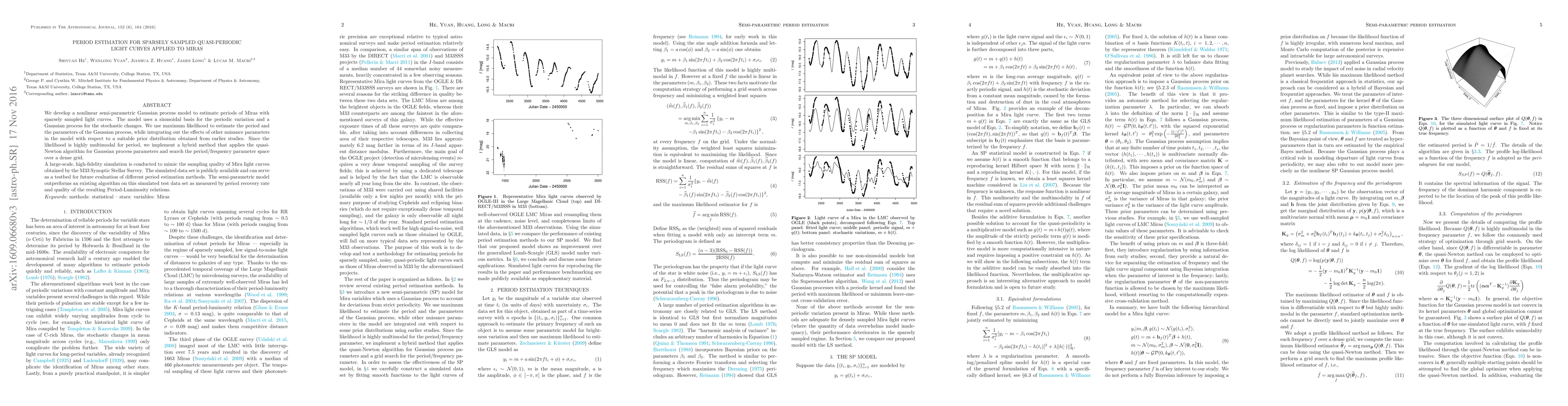 We develop a non-linear semi-parametric Gaussian process model to estimate periods of Miras with sparsely-sampled light curves. The model uses a sinusoidal basis for the periodic variation and a Gaussian process for the stochastic changes. We use maximum likelihood to estimate the period and the parameters of the Gaussian process, while integrating out the effects of other nuisance parameters in the model with respect to a suitable prior distribution obtained from earlier studies. Since the likelihood is highly multimodal for period, we implement a hybrid method that applies the quasi-Newton algorithm for Gaussian process parameters and search the period/frequency parameter over a dense grid. A large-scale, high-fidelity simulation is conducted to mimic the sampling quality of Mira light curves obtained by the M33 Synoptic Stellar Survey. The simulated data set is publicly available and can serve as a testbed for future evaluation of different period estimation methods. The semi-parametric model outperforms an existing algorithm on this simulated test data set as measured by period recovery rate and quality of the resulting Period-Luminosity relations.