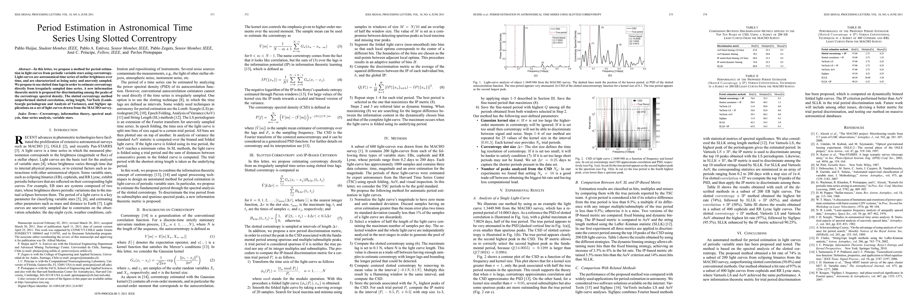This paper proposes a slotted correntropy method for estimating periods in noisy, unevenly sampled light curves from variable stars. The method outperforms traditional techniques like correlation and periodogram analysis on a dataset from the MACHO survey.