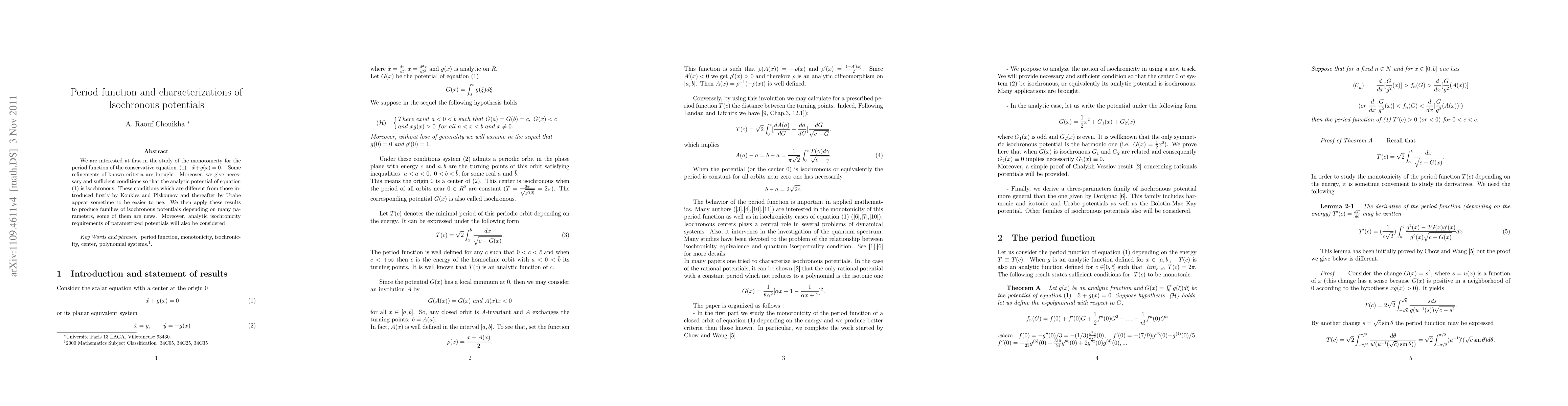 We are interested at first in the study of the monotonicity for the period function of the conservative equation \ $(1)\quad \ddot x + g(x) = 0.$\quad Some refinements of known criteria are brought. Moreover, we give necessary and sufficient conditions so that the analytic potential of equation $(1)$ is isochronous. These conditions which are different from those introduced firstly by Koukles and Piskounov and thereafter by Urabe appear sometime to be easier to use. We then apply these results to produce families of isochronous potentials depending on many parameters, some of them are news. Moreover, analytic isochronicity requirements of parametrized potentials will also be considered