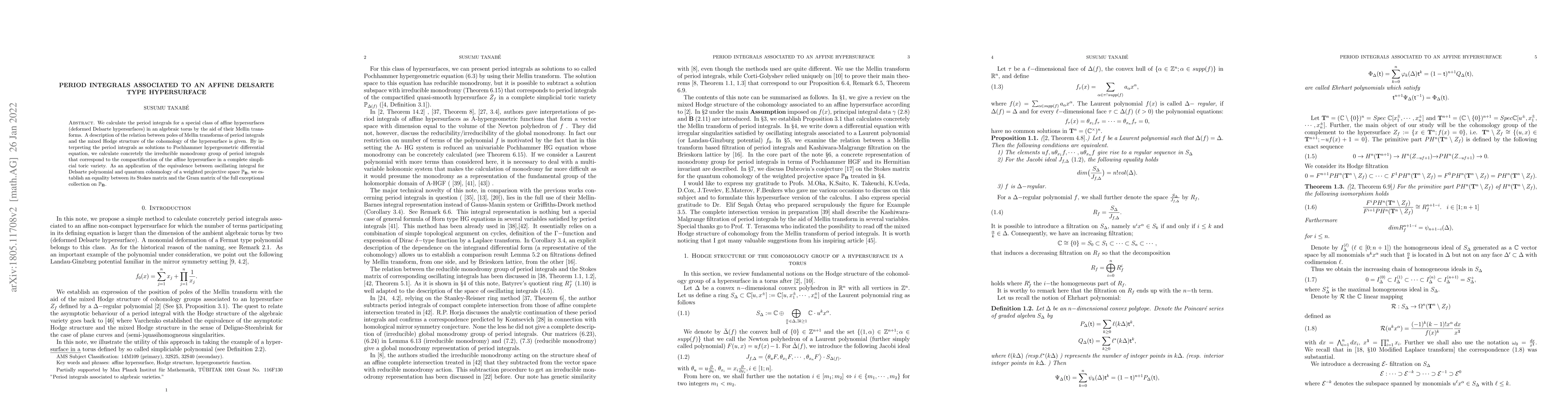 We calculate the period integrals for a special class of affine hypersurfaces (deformed Delsarte hypersurfaces) in an algebraic torus by the aid of their Mellin transforms. A description of the relation between poles of Mellin transforms of period integrals and the mixed Hodge structure of the cohomology of the hypersurface is given. By interpreting the period integrals as solutions to Pochhammer hypergeometric differential equation, we calculate concretely the irreducible monodromy group of period integrals that correspond to the compactification of the affine hypersurface in a complete simplicial toric variety. As an application of the equivalence between oscillating integral for Delsarte polynomial and quantum cohomology of a weighted projective space $\mathbb{P}_{\bf B}$, we establish an equality between its Stokes matrix and the Gram matrix of the full exceptional collection on $\mathbb{P}_{\bf B}$.