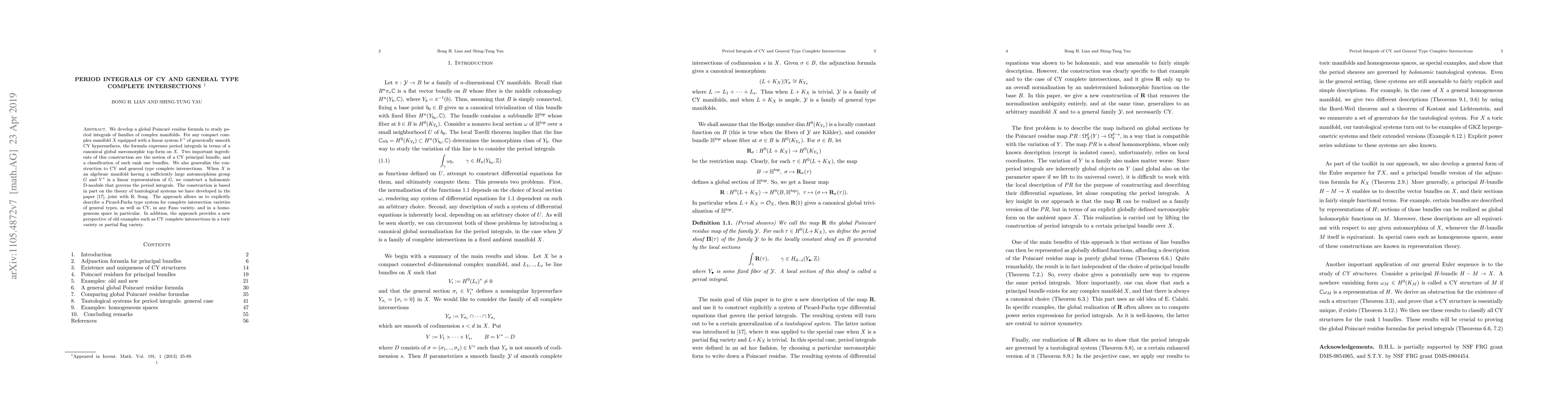 We develop a global Poincar\'e residue formula to study period integrals of families of complex manifolds. For any compact complex manifold $X$ equipped with a linear system $V^*$ of generically smooth CY hypersurfaces, the formula expresses period integrals in terms of a canonical global meromorphic top form on $X$. Two important ingredients of our construction are the notion of a CY principal bundle, and a classification of such rank one bundles. We also generalize our construction to CY and general type complete intersections. When $X$ is an algebraic manifold having a sufficiently large automorphism group $G$ and $V^*$ is a linear representation of $G$, we construct a holonomic D-module that governs the period integrals. The construction is based in part on the theory of tautological systems we have developed in the paper \cite{LSY1}, joint with R. Song. The approach allows us to explicitly describe a Picard-Fuchs type system for complete intersection varieties of general types, as well as CY, in any Fano variety, and in a homogeneous space in particular. In addition, the approach provides a new perspective of old examples such as CY complete intersections in a toric variety or partial flag variety.