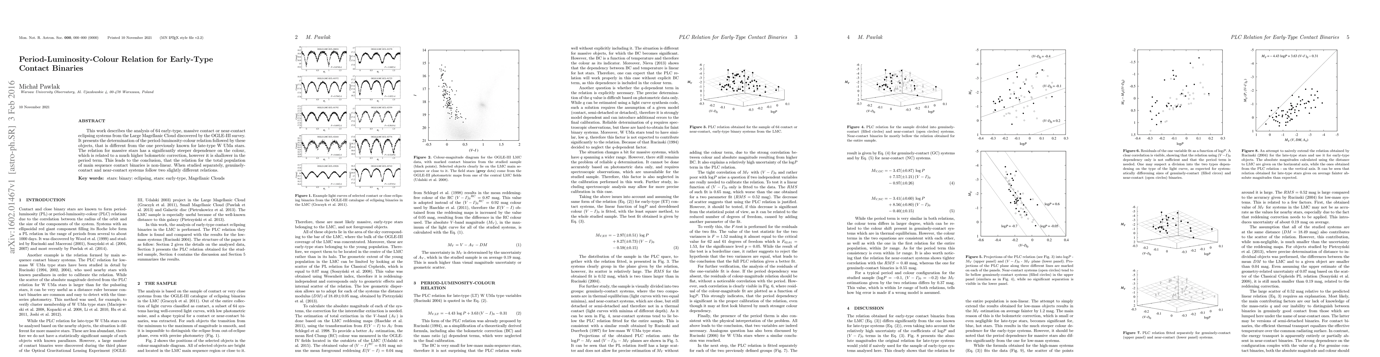 This work describes the analysis of 64 early-type, massive contact or near-contact eclipsing systems from the Large Magellanic Cloud discovered by the OGLE-III survey. It presents the determination of the period-luminosity-colour relation followed by these objects, that is different from the one previously known for late-type W UMa stars. The relation for massive stars has a significantly steeper dependence on the colour, which is related to a much higher bolometric correction, however it is shallower in the period term. This leads to the conclusion, that the relation for the total population of main sequence contact binaries is non-linear. When studied separately, genuinely-contact and near-contact systems follow two slightly different relations.