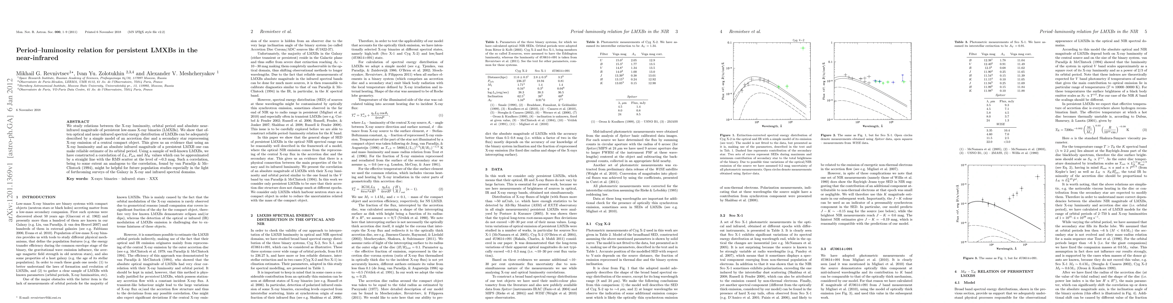 We study relations between the X-ray luminosity, orbital period and absolute near-infrared magnitude of persistent low-mass X-ray binaries (LMXBs). We show that often optical and near-infrared spectral energy distribution of LMXBs can be adequately described by a simple model of an accretion disc and a secondary star reprocessing X-ray emission of a central compact object. This gives us an evidence that using an X-ray luminosity and an absolute infrared magnitude of a persistent LMXB one can make reliable estimate of its orbital period. Using a sample of well-known LMXBs, we have constructed a correlation of L_X, P_orb and M_K values which can be approximated by a straight line with the RMS scatter at the level of ~0.3 mag. Such a correlation, being to some extent an analogous to the correlation, found by van Paradijs & McClintock 1994, might be helpful for future population studies especially in the light of forthcoming surveys of the Galaxy in X-ray and infrared spectral domains.