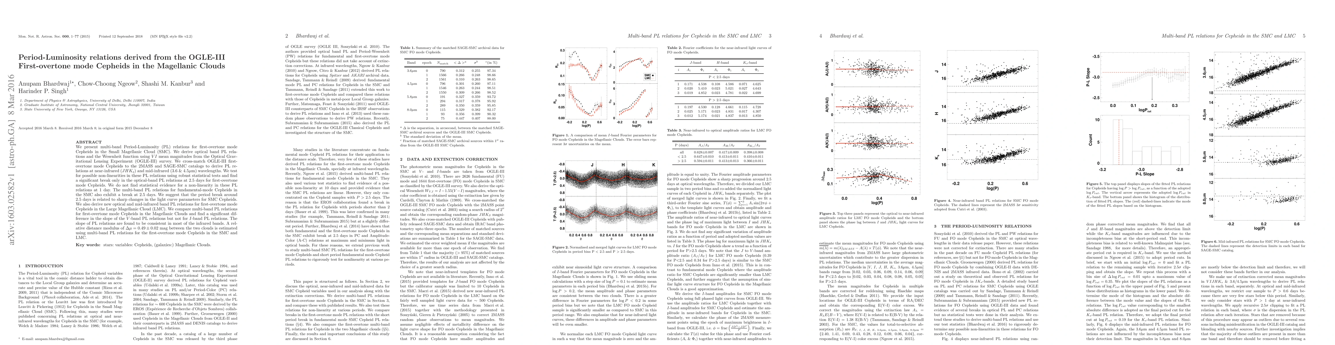 This paper derives multi-band Period-Luminosity relations for first-overtone mode Cepheids in the SMC and LMC, finding a significant break in optical relations at 2.5 days and a relative distance modulus of 0.49±0.02 mag between the two clouds.