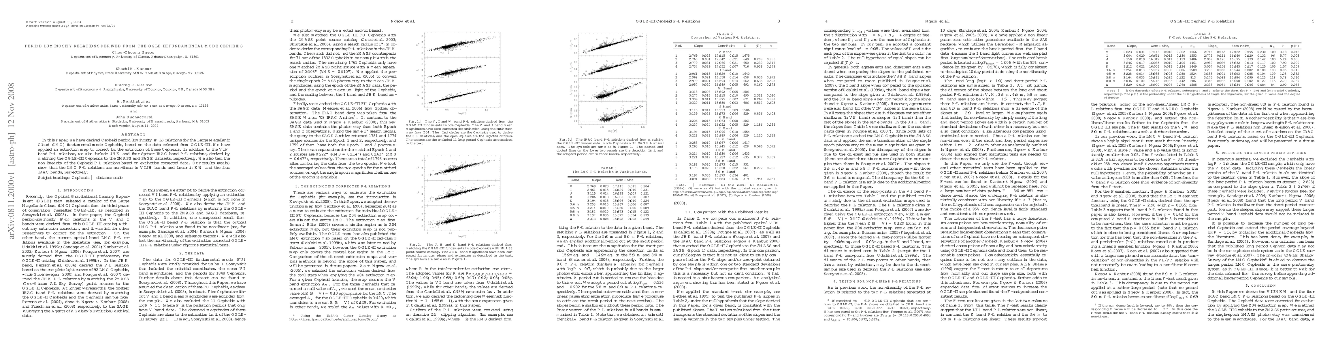 This paper derives period-luminosity relations for fundamental mode Cepheids in the Large Magellanic Cloud using OGLE-III data, correcting for extinction. It finds non-linear P-L relations in VIJH bands and linear relations in K and Spitzer IRAC bands.