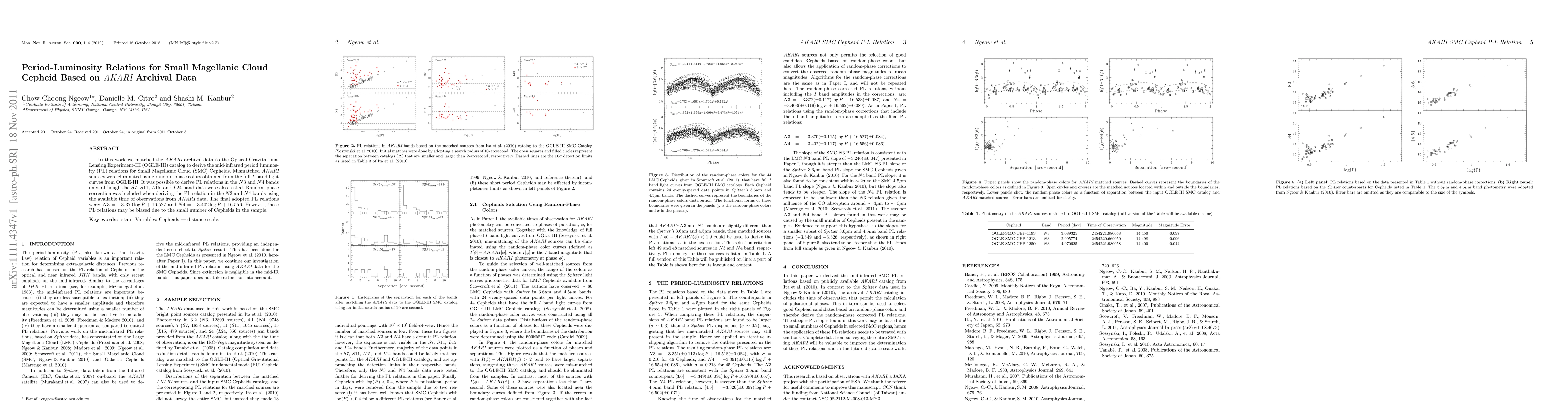 This study matches AKARI archival data with OGLE-III catalog to derive mid-infrared period-luminosity relations for Small Magellanic Cloud Cepheids, resulting in PL relations for N3 and N4 bands: N3 = -3.370 logP + 16.527 and N4 = -3.402 logP + 16.556, though the sample size may introduce bias.