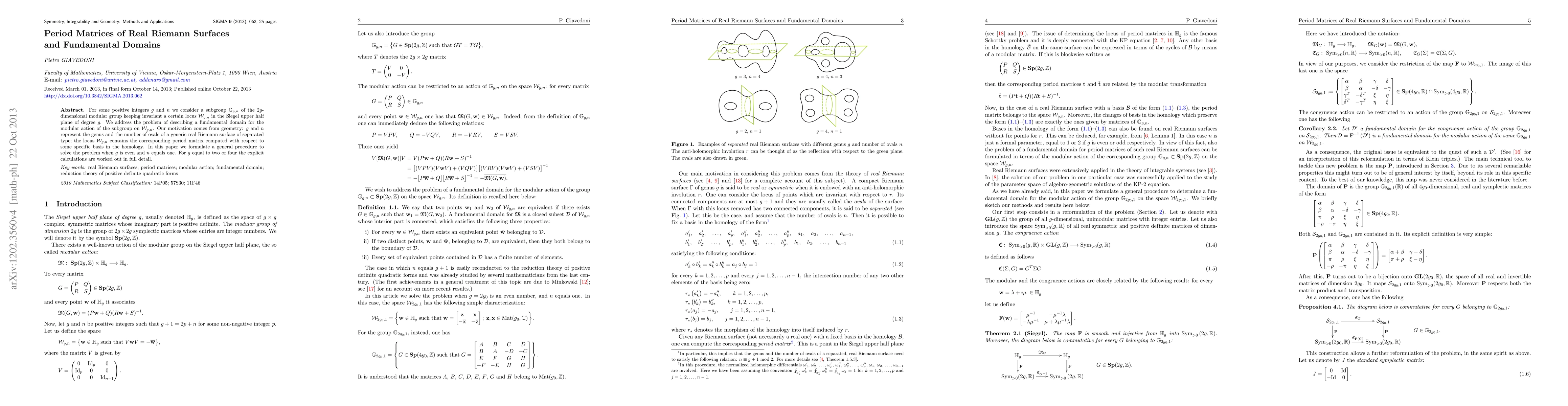For some positive integers $g$ and $n$ we consider a subgroup $\mathbb{G}_{g,n}$ of the $2g$-dimensional modular group keeping invariant a certain locus $\mathcal{W}_{g,n}$ in the Siegel upper half plane of degree $g$. We address the problem of describing a fundamental domain for the modular action of the subgroup on $\mathcal{W}_{g,n}$. Our motivation comes from geometry: $g$ and $n$ represent the genus and the number of ovals of a generic real Riemann surface of separated type; the locus $\mathcal{W}_{g,n}$ contains the corresponding period matrix computed with respect to some specific basis in the homology. In this paper we formulate a general procedure to solve the problem when $g$ is even and $n$ equals one. For $g$ equal to two or four the explicit calculations are worked out in full detail.