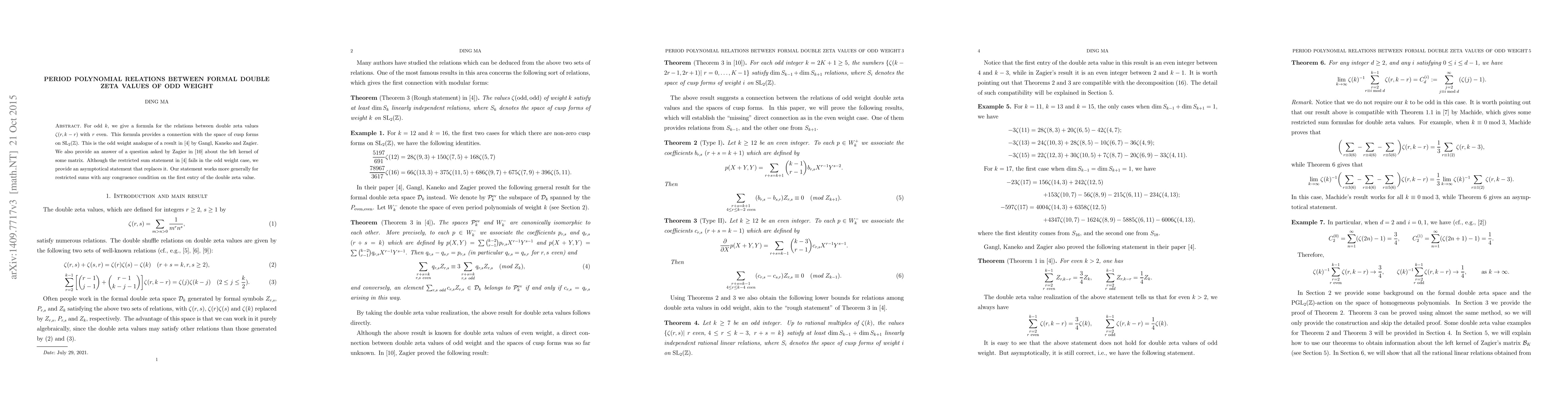 This paper presents a formula for relations between double zeta values of odd weight, establishing a link with cusp forms on $\mathrm{SL}_2(\mathbb{Z})$, and addresses a question by Zagier regarding the left kernel of a matrix, offering an asymptotical statement for restricted sums with congruence conditions.