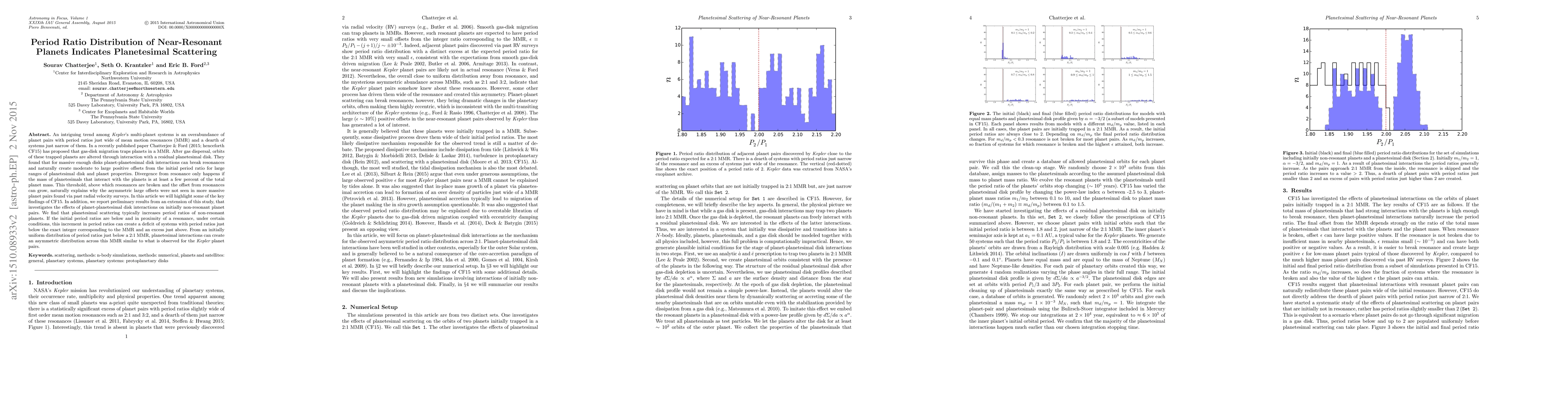 This paper investigates the period ratio distribution of near-resonant planets in Kepler's multi-planet systems, proposing that planetesimal scattering explains the observed asymmetry. The study extends previous findings by showing that planetesimal interactions can create an asymmetric distribution of period ratios, mirroring the observed deficit below and excess above certain resonances.