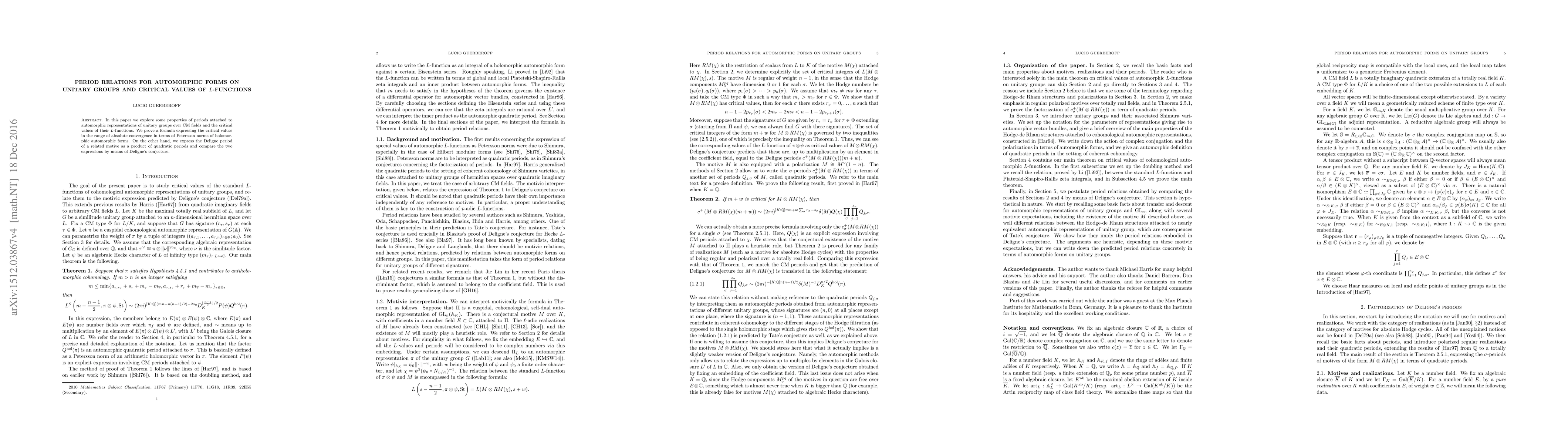 This paper investigates periods linked to automorphic representations of unitary groups over CM fields and the critical values of their $L$-functions, proving a formula for critical values in terms of Petersson norms and comparing related motives through Deligne's conjecture.