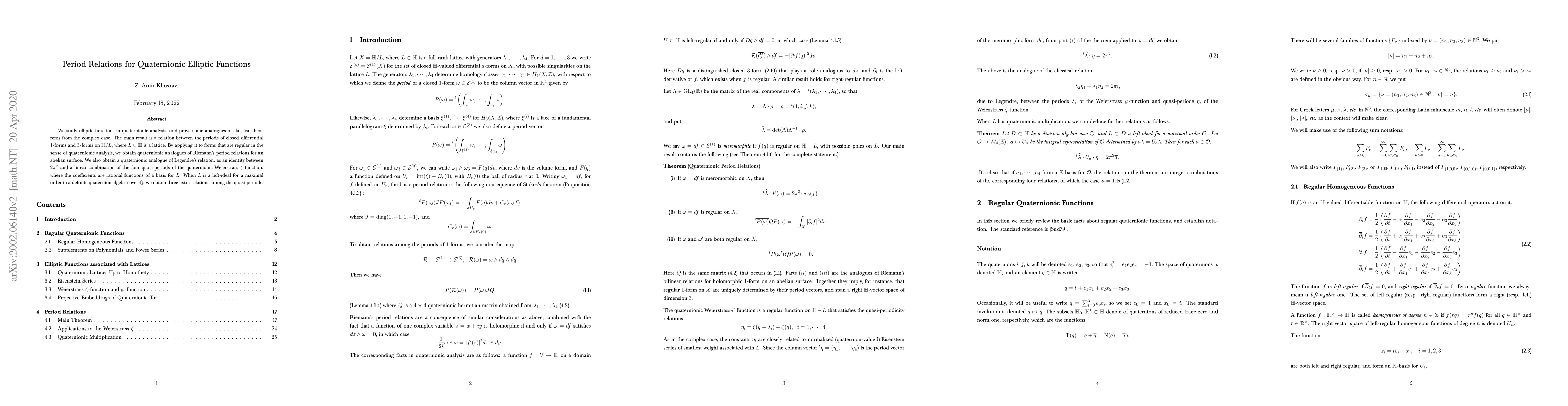 We study elliptic functions in quaternionic analysis, and prove some analogues of classical theorems from the complex case. The main result is a relation between the periods of closed differential 1-forms and 3-forms on H/L where L is a lattice in H. By applying to forms that are regular in the sense of quaternionic analysis, we obtain quaternionic analogues of Riemann's period relations for an abelian surface. We also obtain a quaternionic analogue of Legendre's relation, as an equality between $2\pi^2$ and a linear combination of the four quasi-periods of the quaternionic Weierstrass $\zeta$-function, where the coefficients are rational functions of a basis for L. When L is a left-ideal for a maximal order in a definite quaternion algebra over Q, we obtain three further relations among the quasi-periods.