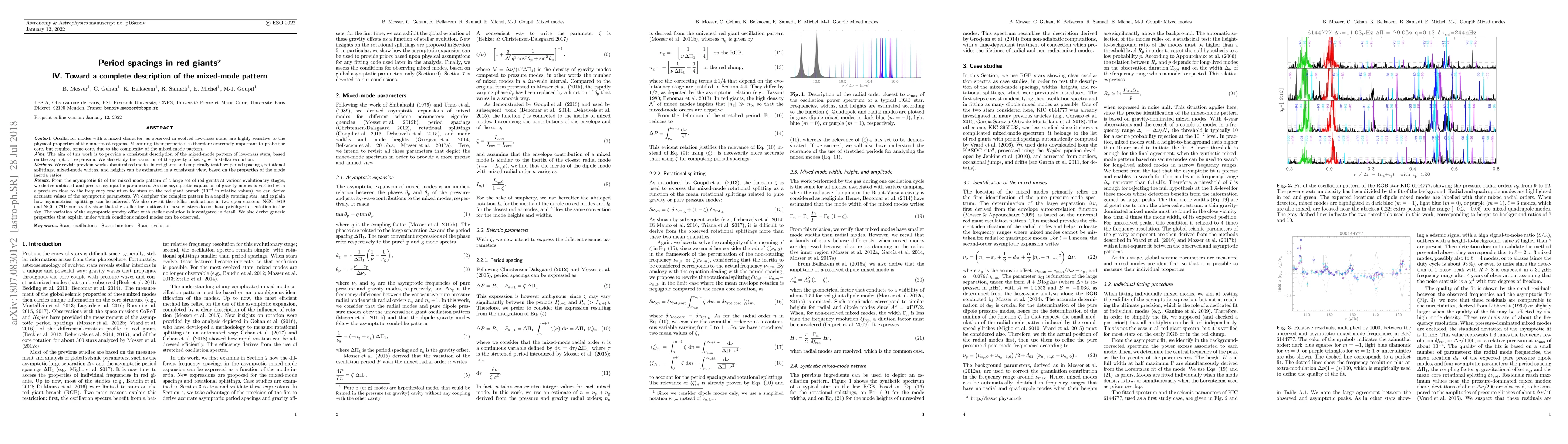 This paper provides a comprehensive description of the mixed-mode oscillation pattern in red giants, focusing on period spacings and their relation to the core properties. It derives precise asymptotic parameters and investigates the variation of the gravity offset $\varepsilon_{g}$ with stellar evolution, revealing no privileged orientation of stellar inclinations in two open clusters.