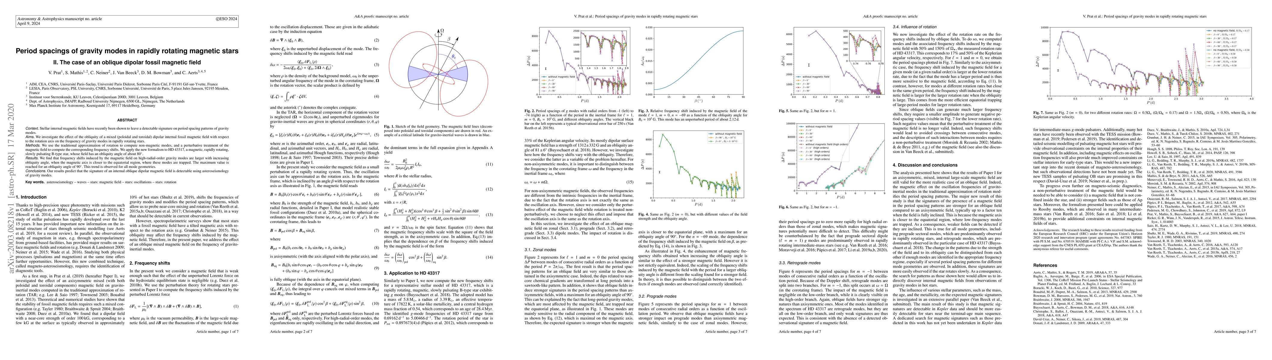 Context. Stellar internal magnetic fields have recently been shown to leave a detectable signature on period spacing patterns of gravity modes. Aims. We investigate the effect of the obliquity of a mixed (poloidal and toroidal) dipolar internal fossil magnetic field with respect to the rotation axis on the frequency of gravity modes in rapidly rotating stars. Methods. We use the traditional approximation of rotation to compute non-magnetic modes, and a perturbative treatment of the magnetic field to compute the corresponding frequency shifts. We apply the new formalism to HD 43317, a magnetic, rapidly rotating, slowly pulsating B-type star, whose field has an obliquity angle of about 80{\deg}. Results. We find that frequency shifts induced by the magnetic field on high-radial-order gravity modes are larger with increasing obliquity angle, when the magnetic axis is closer to the equatorial region, where these modes are trapped. The maximum value is reached for an obliquity angle of 90{\deg}. This trend is observed for all mode geometries. Conclusions. Our results predict that the signature of an internal oblique dipolar magnetic field is detectable using asteroseismology of gravity modes.