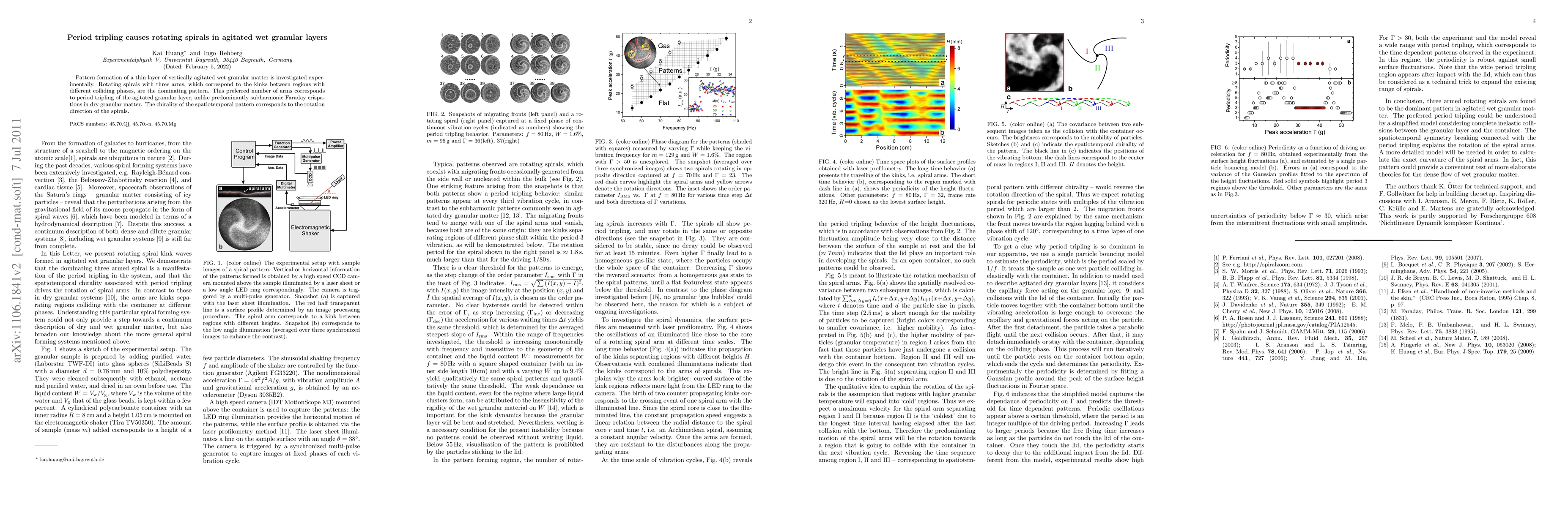 This study experimentally investigates pattern formation in vertically agitated wet granular layers, revealing rotating spirals with three arms due to period tripling, contrasting with subharmonic patterns in dry granular matter. The chirality of these spirals aligns with the rotation direction of the agitation.