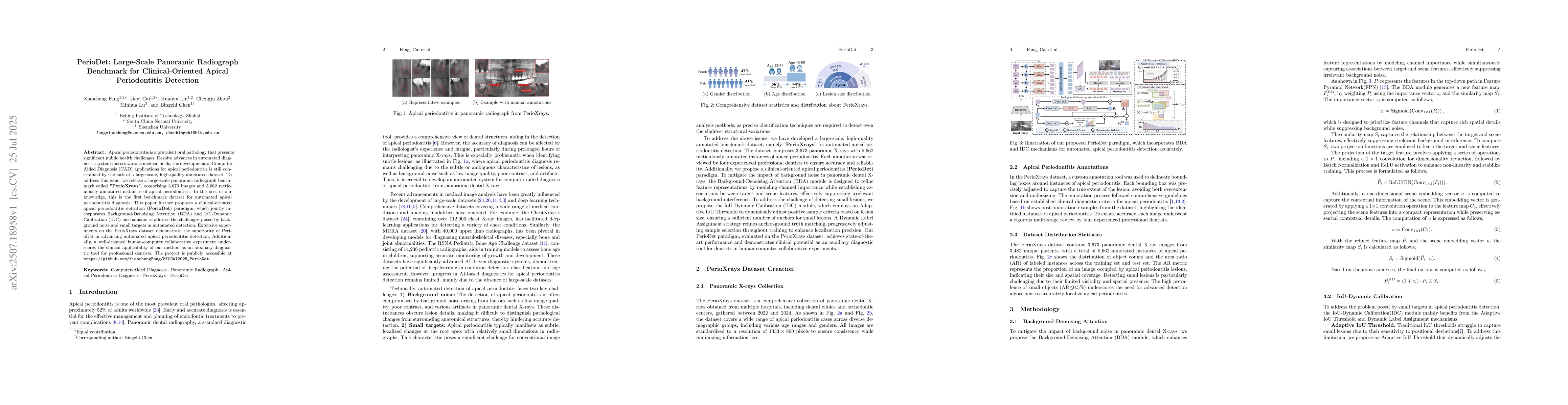 Apical periodontitis is a prevalent oral pathology that presents significant public health challenges. Despite advances in automated diagnostic systems across various medical fields, the development of Computer-Aided Diagnosis (CAD) applications for apical periodontitis is still constrained by the lack of a large-scale, high-quality annotated dataset. To address this issue, we release a large-scale panoramic radiograph benchmark called "PerioXrays", comprising 3,673 images and 5,662 meticulously annotated instances of apical periodontitis. To the best of our knowledge, this is the first benchmark dataset for automated apical periodontitis diagnosis. This paper further proposes a clinical-oriented apical periodontitis detection (PerioDet) paradigm, which jointly incorporates Background-Denoising Attention (BDA) and IoU-Dynamic Calibration (IDC) mechanisms to address the challenges posed by background noise and small targets in automated detection. Extensive experiments on the PerioXrays dataset demonstrate the superiority of PerioDet in advancing automated apical periodontitis detection. Additionally, a well-designed human-computer collaborative experiment underscores the clinical applicability of our method as an auxiliary diagnostic tool for professional dentists.