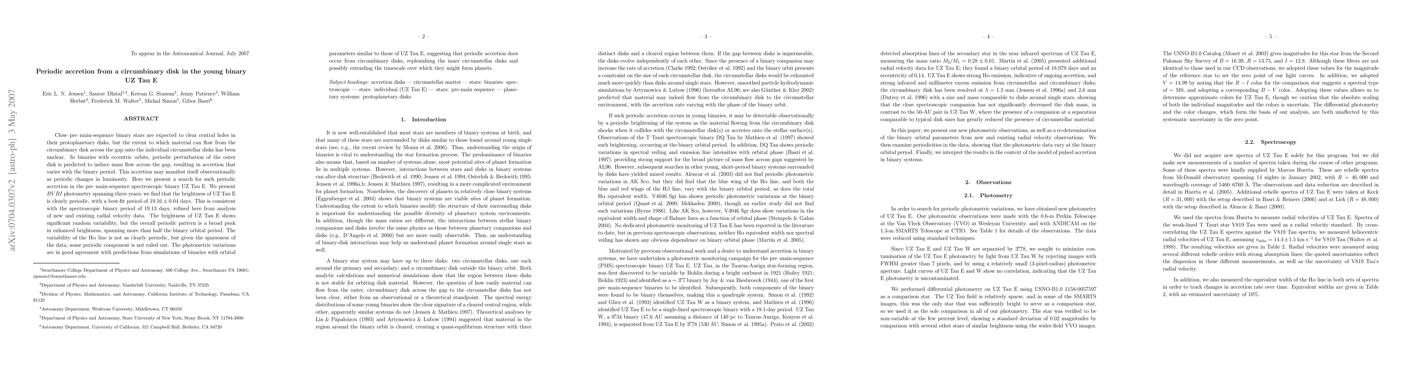 This study investigates periodic accretion in the binary system UZ Tau E, finding a clear periodic brightness variation with a 19.16-day period matching the binary orbital period. The results suggest periodic accretion from a circumbinary disk, consistent with simulations, supporting the replenishment of inner disks and potential planet formation.