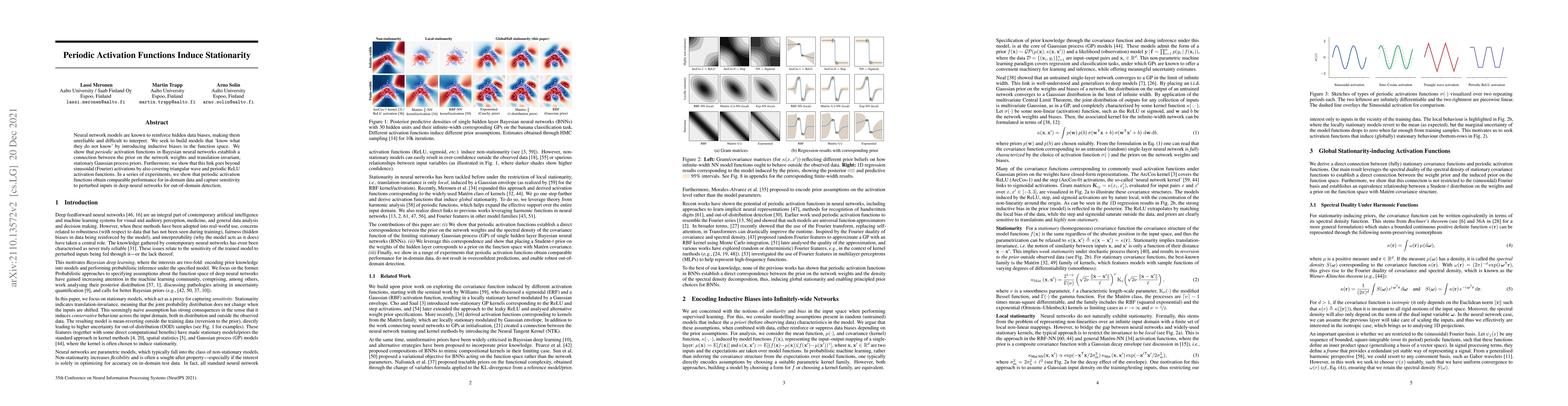 Neural network models are known to reinforce hidden data biases, making them unreliable and difficult to interpret. We seek to build models that `know what they do not know' by introducing inductive biases in the function space. We show that periodic activation functions in Bayesian neural networks establish a connection between the prior on the network weights and translation-invariant, stationary Gaussian process priors. Furthermore, we show that this link goes beyond sinusoidal (Fourier) activations by also covering triangular wave and periodic ReLU activation functions. In a series of experiments, we show that periodic activation functions obtain comparable performance for in-domain data and capture sensitivity to perturbed inputs in deep neural networks for out-of-domain detection.