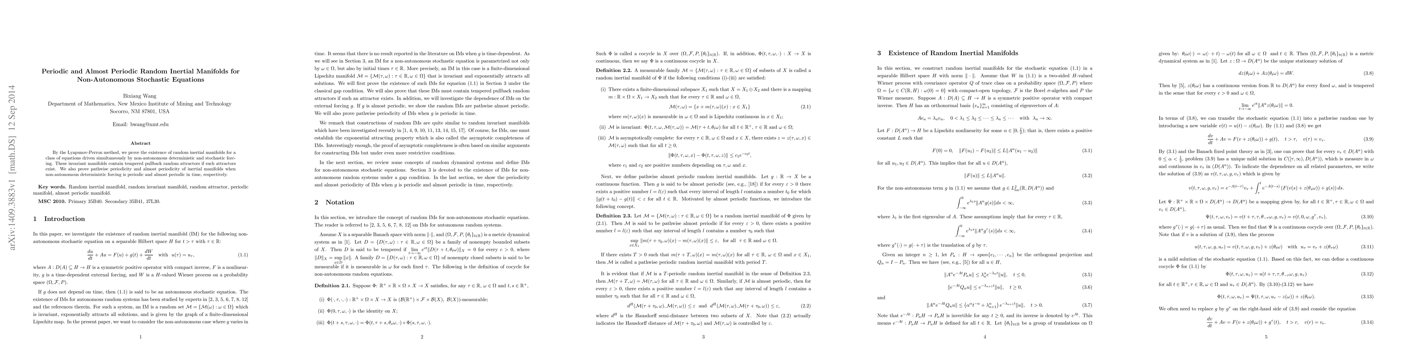 This paper proves the existence of random inertial manifolds using the Lyapunov-Perron method for non-autonomous stochastic equations. It also demonstrates pathwise periodicity and almost periodicity of these manifolds under periodic and almost periodic deterministic forcing.