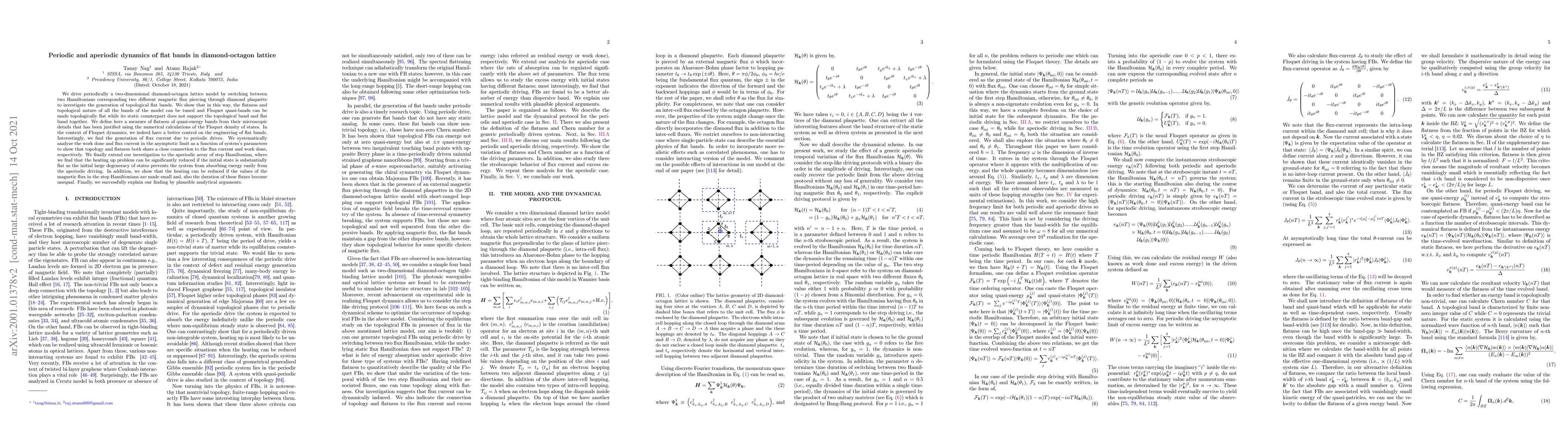 This paper investigates the dynamics of flat bands in a diamond-octagon lattice model under periodic driving, demonstrating that topological flat bands can be generated and tuned by switching between different Hamiltonians. It finds that non-equilibrium dynamics allow for better control of flatness compared to static conditions, and links topology and flatness to flux current and work done, respectively.