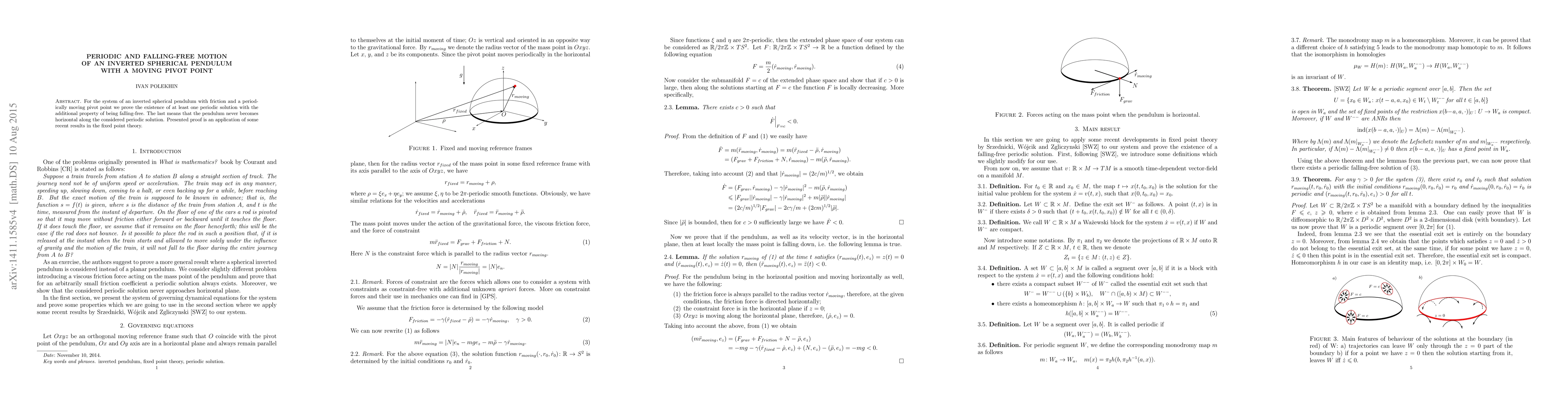 This paper proves the existence of at least one periodic, falling-free solution for an inverted spherical pendulum with friction and a periodically moving pivot point, using fixed point theory. The pendulum remains non-horizontal throughout the periodic motion.