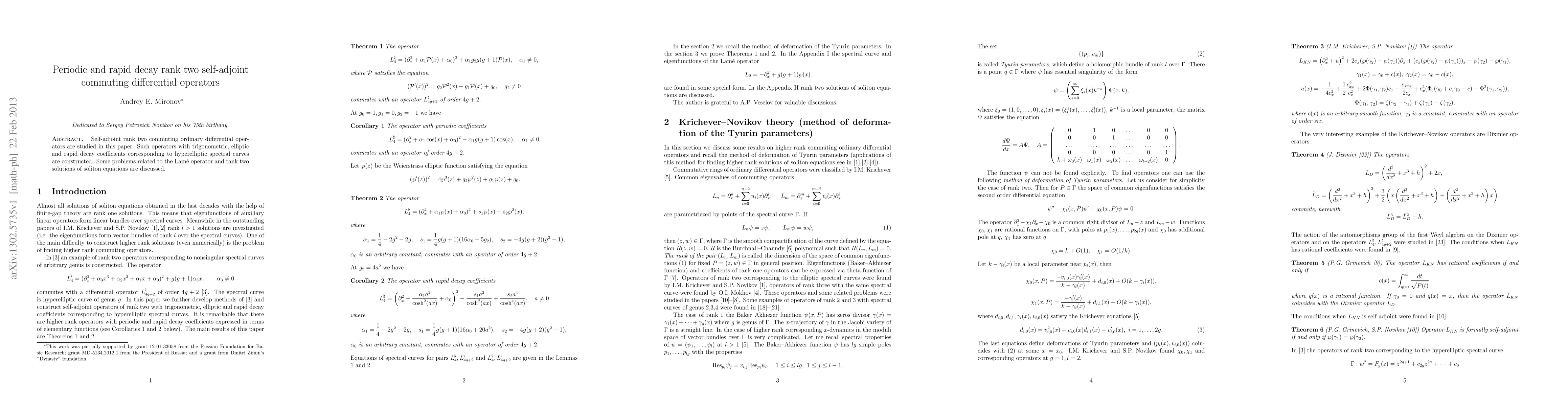 This paper investigates self-adjoint rank two commuting differential operators with specific decay properties, constructing examples with trigonometric, elliptic, and rapid decay coefficients tied to hyperelliptic spectral curves. It also addresses related issues involving the Lame operator and rank two solutions in soliton equations.
