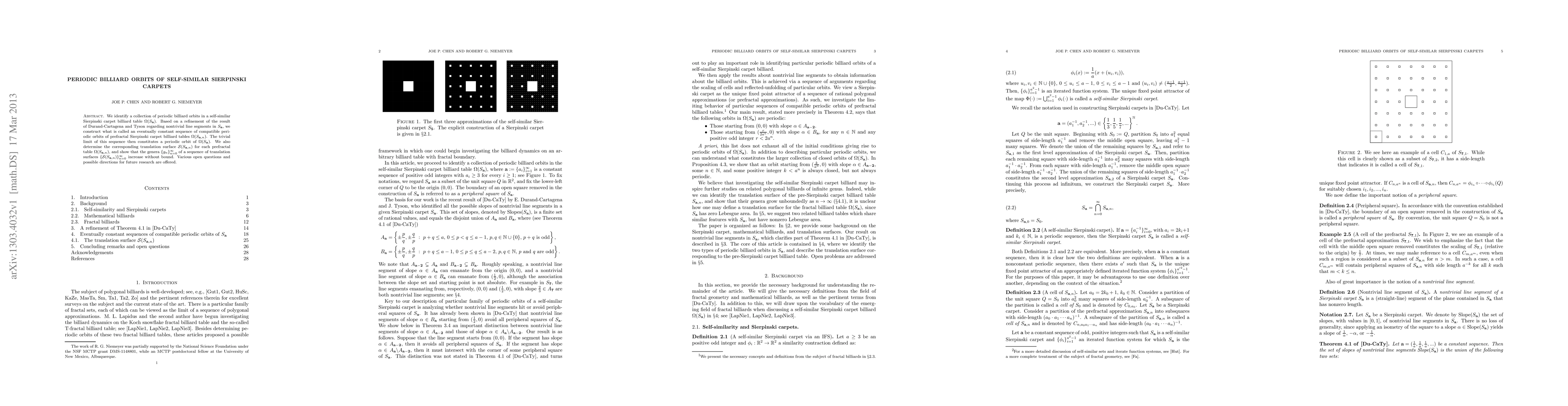 This paper identifies periodic billiard orbits in self-similar Sierpinski carpet billiard tables, constructing a sequence of compatible periodic orbits in prefractal Sierpinski carpets that converge to a nontrivial orbit. It also examines the corresponding translation surfaces, showing their increasing genera.
