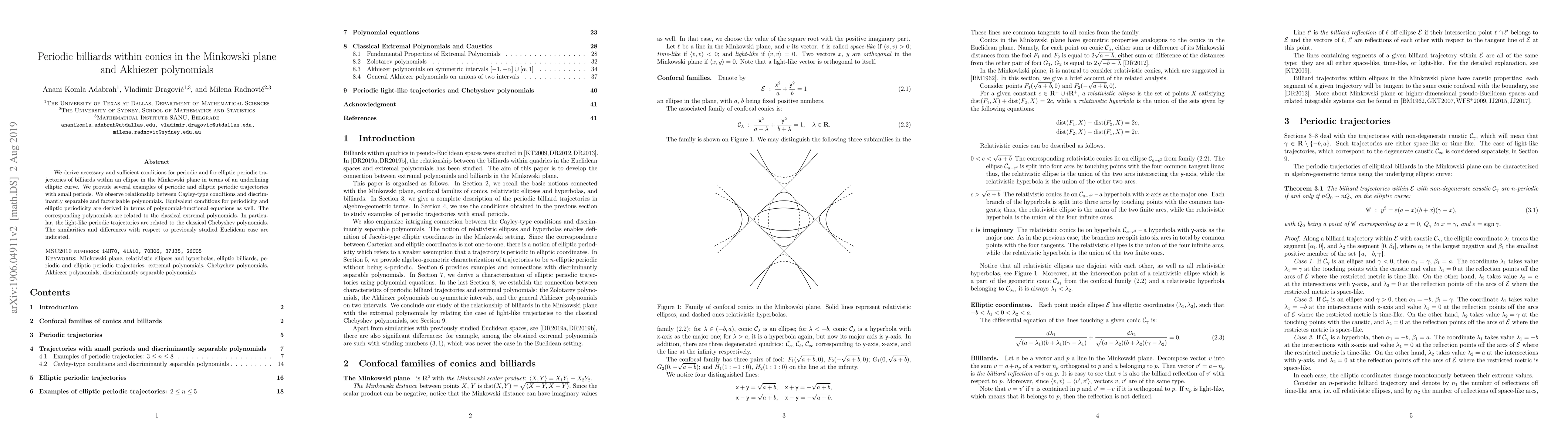 We derive necessary and sufficient conditions for periodic and for elliptic periodic trajectories of billiards within an ellipse in the Minkowski plane in terms of an underlining elliptic curve. We provide several examples of periodic and elliptic periodic trajectories with small periods. We observe relationship between Cayley-type conditions and discriminantly separable and factorizable polynomials. Equivalent conditions for periodicity and elliptic periodicity are derived in terms of polynomial-functional equations as well. The corresponding polynomials are related to the classical extremal polynomials. In particular, the light-like periodic trajectories are related to the classical Chebyshev polynomials. The similarities and differences with respect to previously studied Euclidean case are indicated.