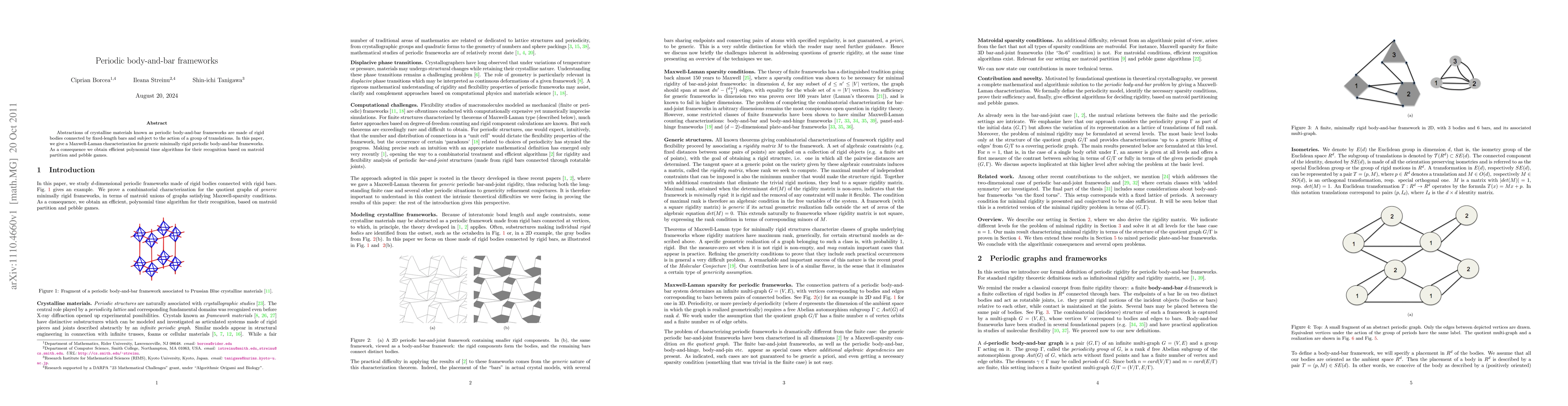 This paper provides a Maxwell-Laman characterization for generic minimally rigid periodic body-and-bar frameworks, leading to efficient polynomial time algorithms for their recognition based on matroid partition and pebble games.