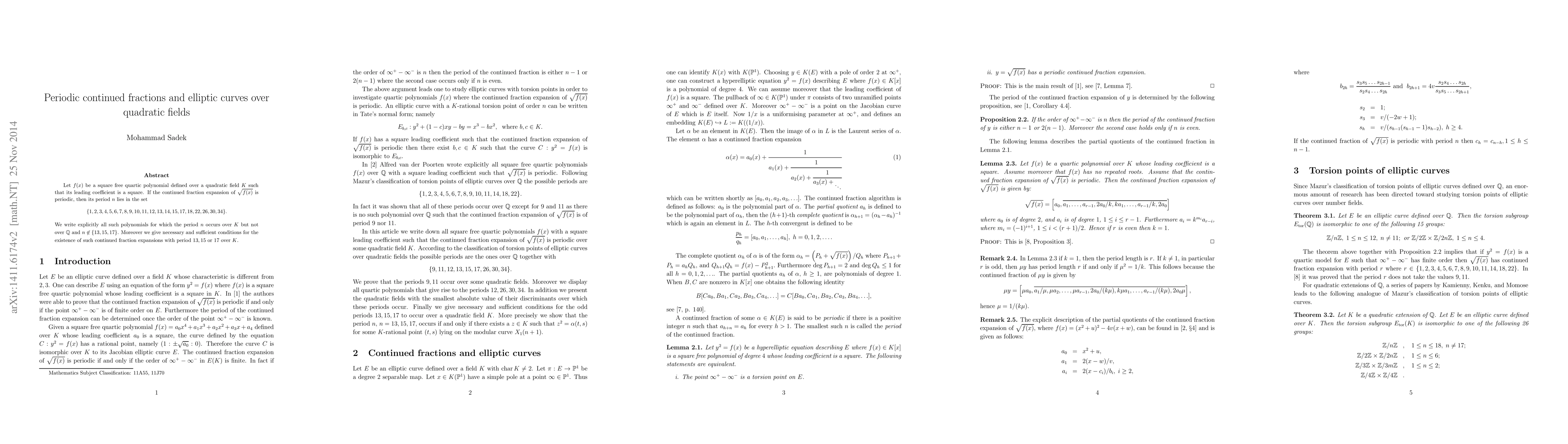 Let $f(x)$ be a square free quartic polynomial defined over a quadratic field $K$ such that its leading coefficient is a square. If the continued fraction expansion of $\displaystyle \sqrt{f(x)}$ is periodic, then its period $n$ lies in the set \[\{1,2,3,4,5,6,7,8,9,10,11,12,13,14,15,17,18,22,26,30,34\}.\] We write explicitly all such polynomials for which the period $n$ occurs over $K$ but not over $\Q$ and $\displaystyle n\not\in\{ 13,15,17\}$. Moreover we give necessary and sufficient conditions for the existence of such continued fraction expansions with period $13, 15$ or $17$ over $K$.