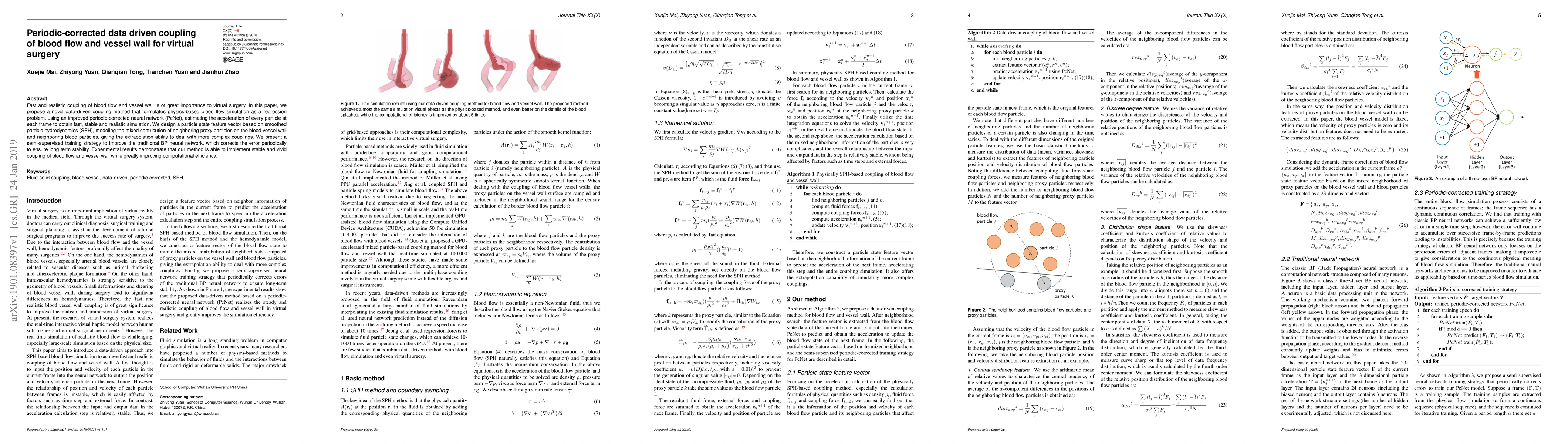 Fast and realistic coupling of blood flow and vessel wall is of great importance to virtual surgery. In this paper, we propose a novel data-driven coupling method that formulates physics-based blood flow simulation as a regression problem, using an improved periodic-corrected neural network (PcNet), estimating the acceleration of every particle at each frame to obtain fast, stable and realistic simulation. We design a particle state feature vector based on smoothed particle hydrodynamics (SPH), modeling the mixed contribution of neighboring proxy particles on the blood vessel wall and neighboring blood particles, giving the extrapolation ability to deal with more complex couplings. We present a semi-supervised training strategy to improve the traditional BP neural network, which corrects the error periodically to ensure long term stability. Experimental results demonstrate that our method is able to implement stable and vivid coupling of blood flow and vessel wall while greatly improving computational efficiency.