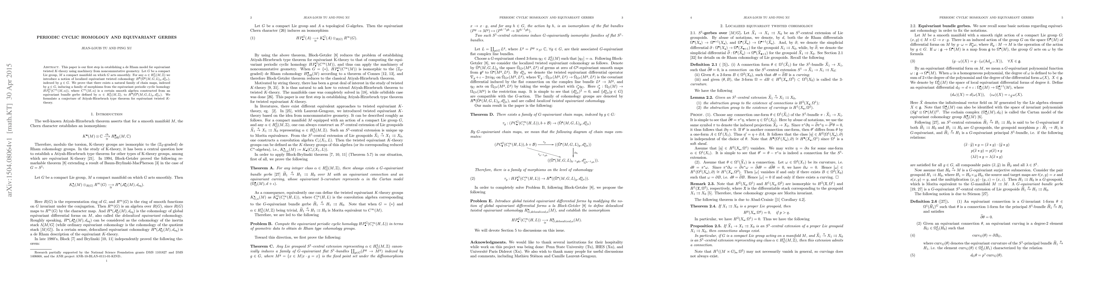This paper is our first step in establishing a de Rham model for equivariant twisted $K$-theory using machinery from noncommutative geometry. Let $G$ be a compact Lie group, $M$ a compact manifold on which $G$ acts smoothly. For any $\alpha \in H^3_G (M, {\mathbb Z})$ we introduce a notion of localized equivariant twisted cohomology $H^\bullet ({\bar{\Omega}}^\bullet (M, G, L)_g, d^\alpha_{G^g})$, indexed by $g\in G$. We prove that there exists a natural family of chain maps, indexed by $g\in G$, inducing a family of morphisms from the equivariant periodic cyclic homology $HP^G_\bullet ( C^\infty (M, \alpha ) )$, where $C^\infty (M, \alpha )$ is a certain smooth algebra constructed from an equivariant bundle gerbe defined by $\alpha \in H^3_G (M,{\mathbb Z} )$, to $H^\bullet ( {\bar{\Omega}}^\bullet (M, G, L)_g, d^\alpha_{G^g})$. We formulate a conjecture of Atiyah-Hirzebruch type theorem for equivariant twisted $K$-theory.
