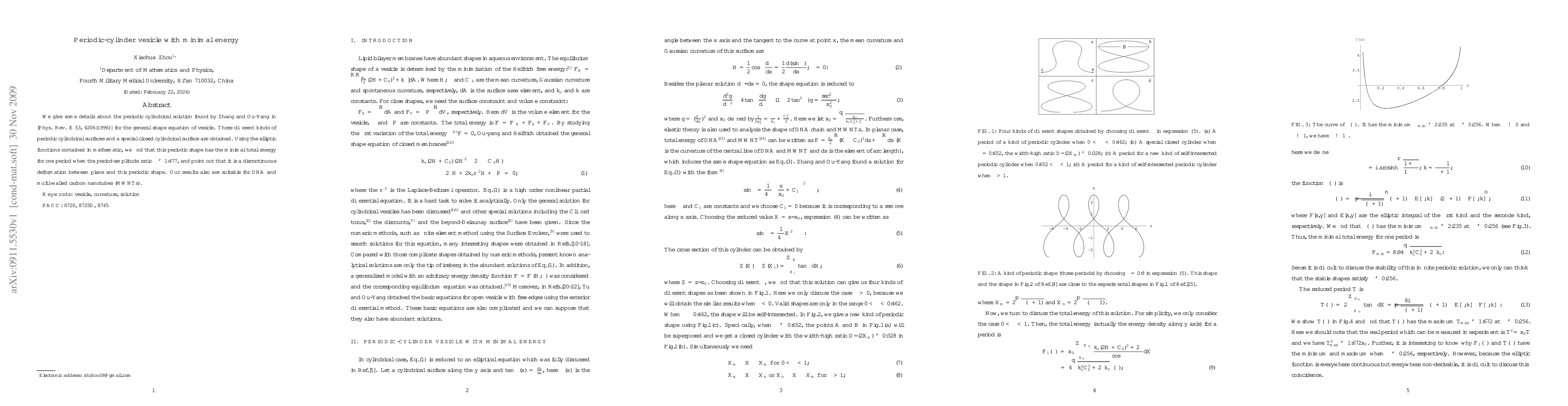 This paper details a periodic cylindrical vesicle shape with minimal energy, derived using elliptic functions. The shape exhibits a discontinuous deformation from flat to periodic, applicable to structures like DNA and multi-walled carbon nanotubes.