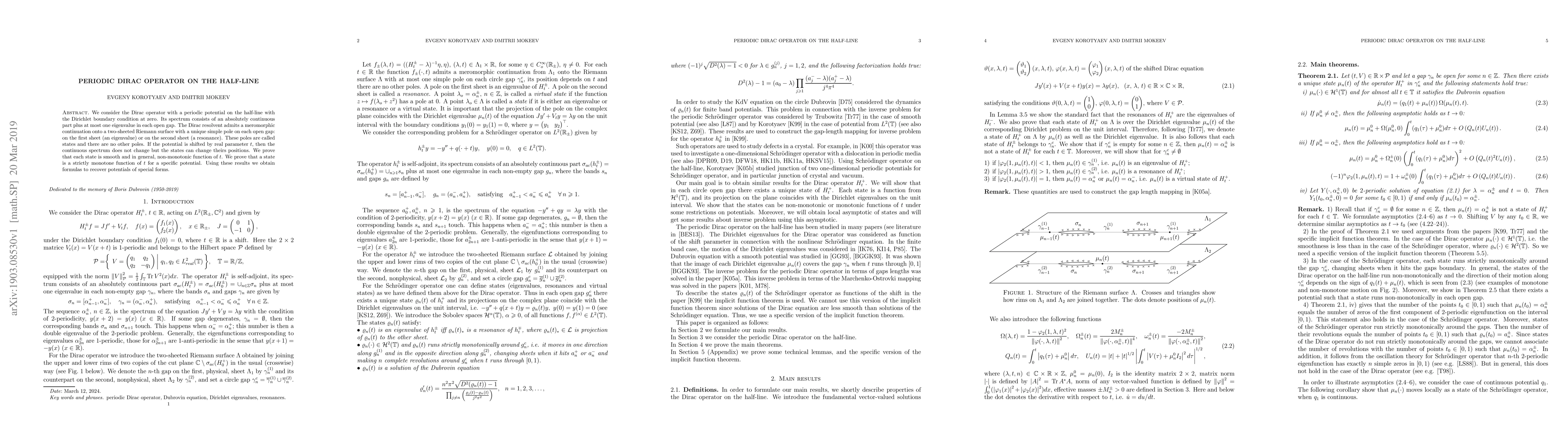 The Dirac operator on a half-line with periodic potential has a unique pole structure, where eigenvalues occur on one sheet and resonances on the other, and these poles can be shifted by real parameter t.