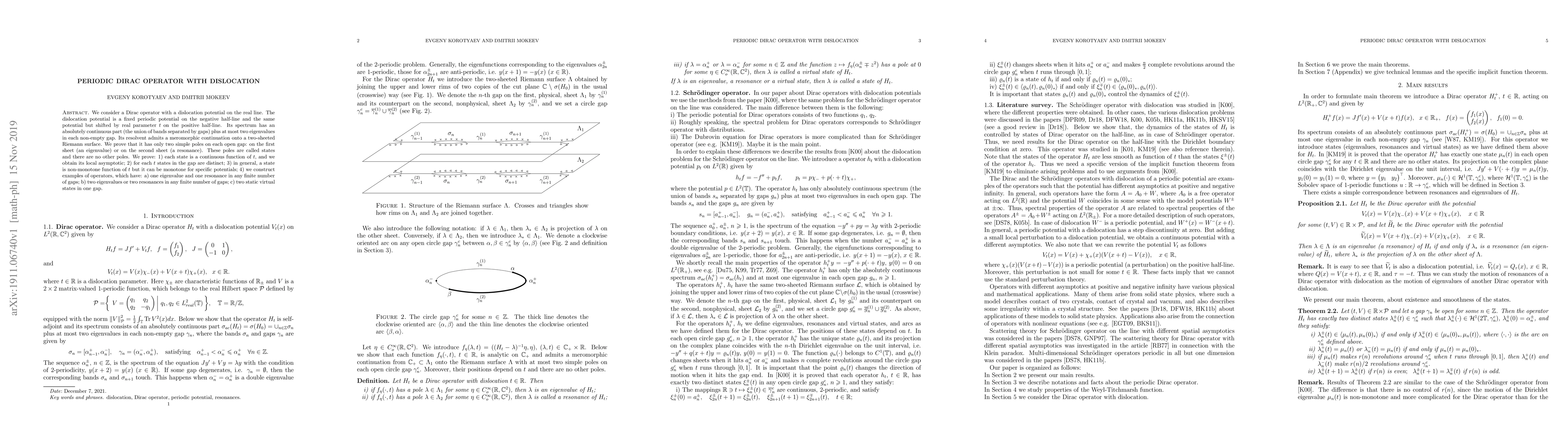 Researchers studied a Dirac operator with dislocation potential, finding that its spectrum has distinct states that behave as continuous functions of the parameter $t$, which can exhibit monotonic behavior in certain cases.
