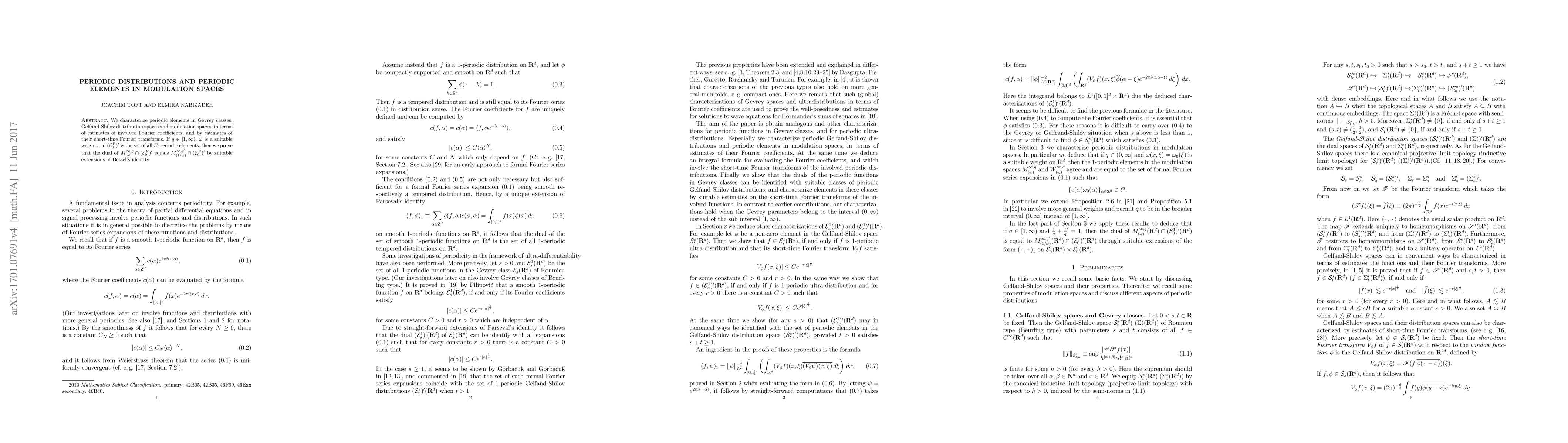 This paper characterizes periodic elements in various distribution spaces using Fourier coefficient and short-time Fourier transform estimates. It establishes a duality relationship between certain periodic elements in modulation spaces and Gevrey classes, leveraging extensions of Bessel's identity.