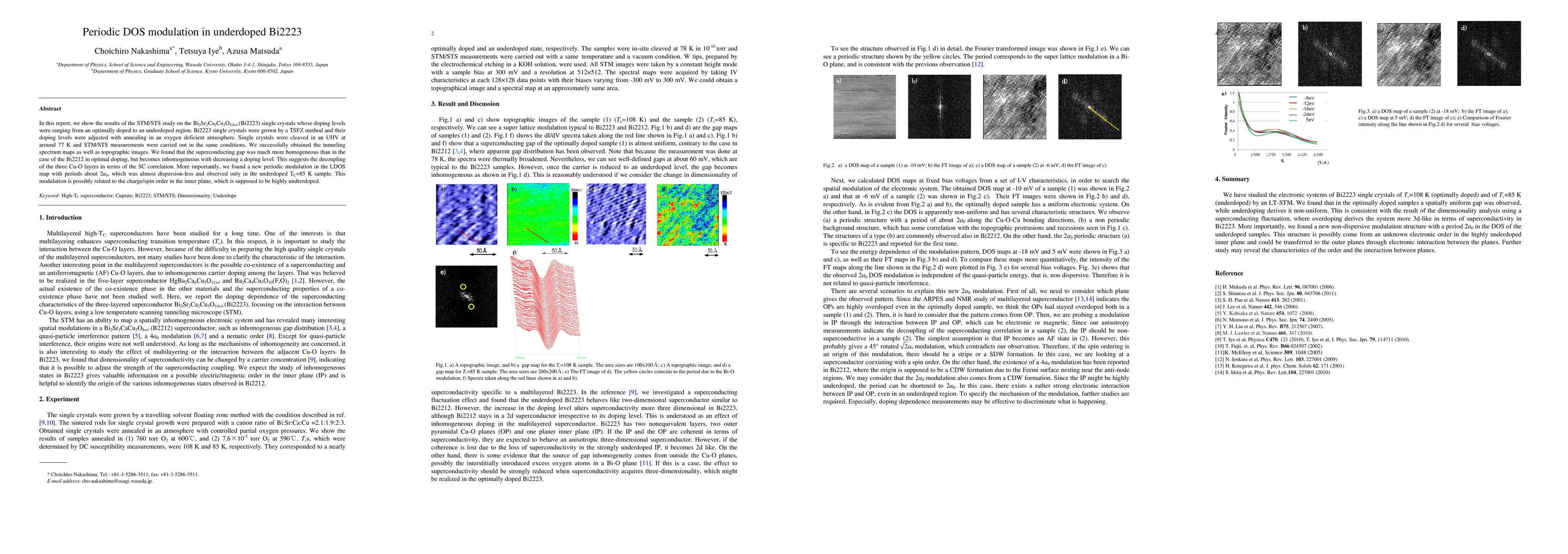 In this report, we show the results of the STM/STS study on the Bi2223 single crystals whose doping levels were ranging from an optimally doped to an underdoped region. Bi2223 single crystals were grown by a TSFZ method and their doping levels were adjusted with annealing in an oxygen deficient atmosphere. Single crystals were cleaved in an UHV at around 77 K and STM/STS measurements were carried out in the same conditions. We successfully obtained the tunneling spectrum maps as well as topographic images. We found that the superconducting gap was much more homogeneous than in the case of the Bi2212 in optimal doping, but becomes inhomogeneous with decreasing a doping level. This suggests the decoupling of the three Cu-O layers in terms of the SC correlation. More importantly, we found a new periodic modulation in the LDOS map with periods about 2a0, which was almost dispersion-less and observed only in the underdoped TC=85 K sample. This modulation is possibly related to the charge/spin order in the inner plane, which is supposed to be highly undrerdoped.