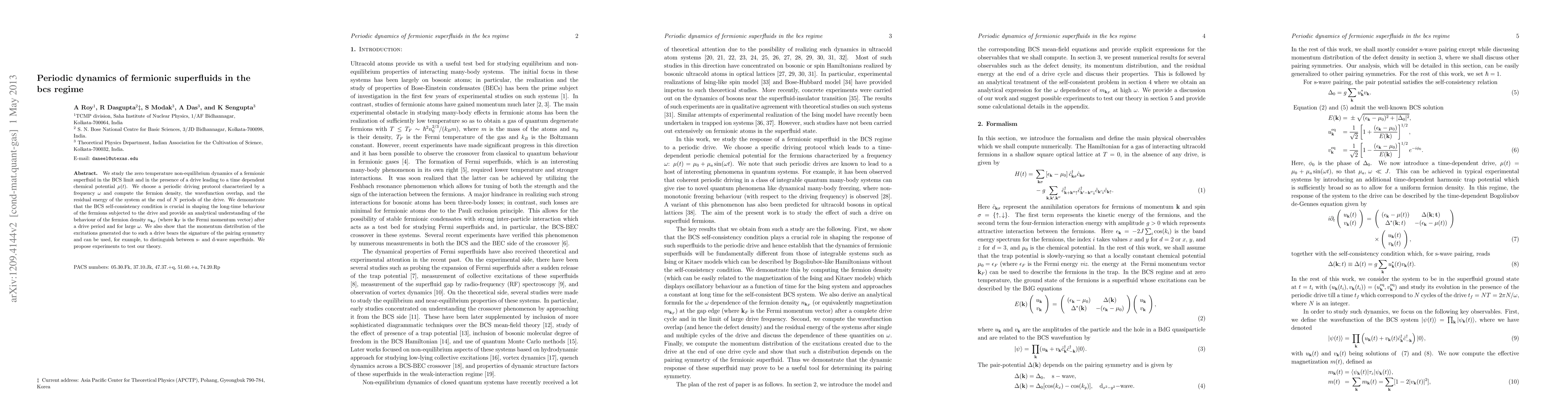 This paper investigates the non-equilibrium dynamics of fermionic superfluids in the BCS regime under periodic driving, revealing the BCS self-consistency condition's role in shaping the long-term behavior and proposing experiments to distinguish between different pairing symmetries based on the momentum distribution of excitations.