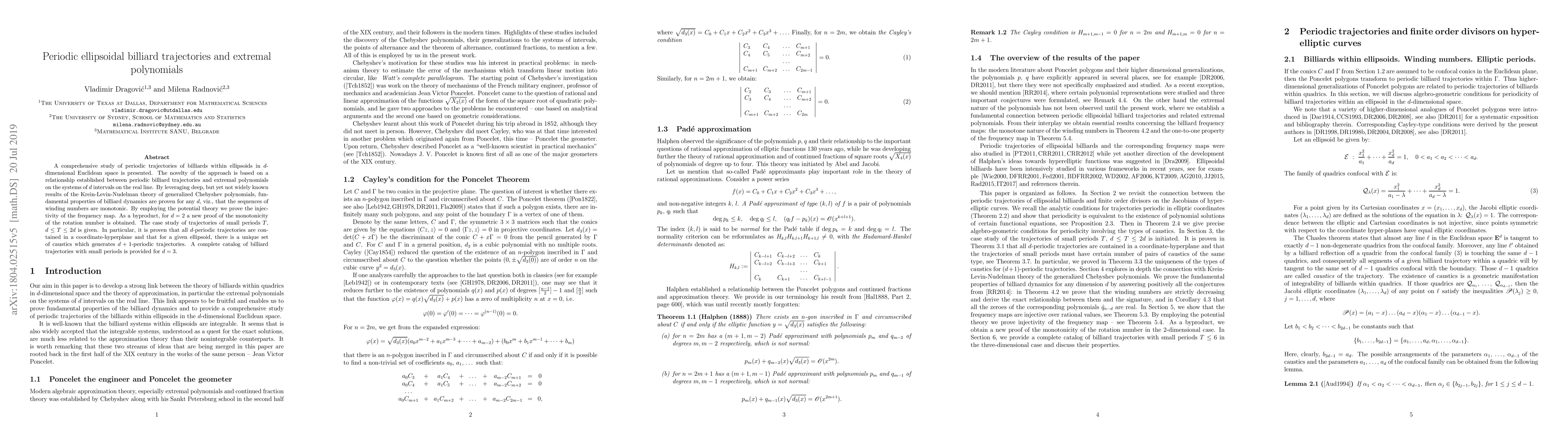 This paper explores periodic trajectories in $d$-dimensional ellipsoidal billiards, linking them to extremal polynomials and generalized Chebyshev polynomials. It proves monotonicity of winding numbers and injectivity of the frequency map, providing a new proof for the monotonicity of the rotation number in 2D and cataloging small-period trajectories for $d=3$.