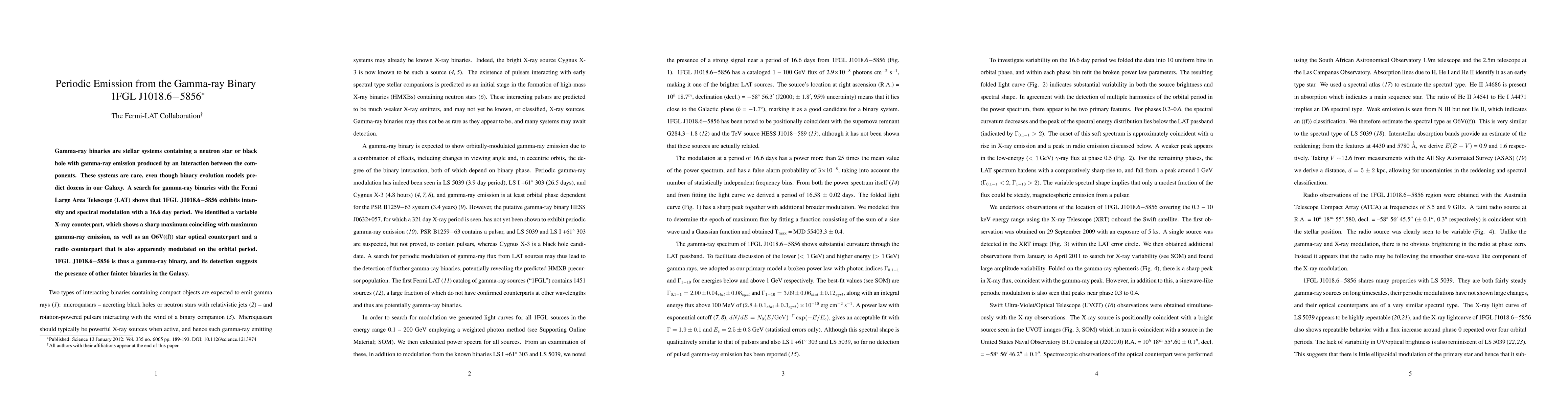 This paper identifies 1FGL J1018.6-5856 as a gamma-ray binary with a 16.6-day periodic emission, featuring a variable X-ray counterpart and modulated optical and radio emissions, suggesting the presence of more such binaries in the Galaxy.