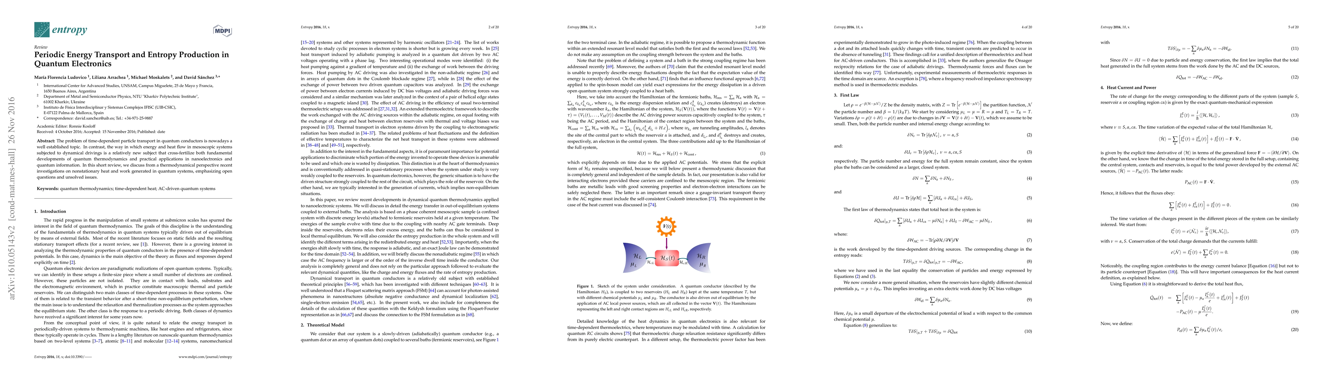 This paper reviews recent advances in understanding periodic energy transport and entropy production in quantum electronics, focusing on nonstationary heat and work in mesoscopic systems under dynamic driving, highlighting unresolved issues and potential applications in nanoelectronics and quantum information.