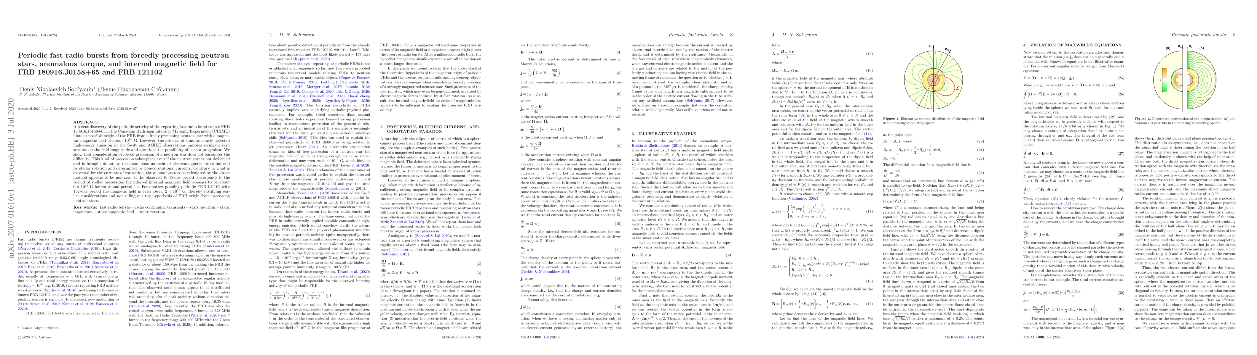 A recent discovery of the periodic activity of the repeating fast radio burst source FRB 180916.J0158+65 in the Canadian Hydrogen Intensity Mapping Experiment (CHIME) hints at possible origin of the FRB from a freely precessing neutron star with a magnetar magnetic field of about $10^{16}$ G. However, the absence of simultaneously detected high-energy emission in the Swift and AGILE observations imposes stringent constraints on the field magnitude and questions the possibility of such a progenitor. We show that consideration of forced precession of a neutron star does not encounter the difficulty. This kind of precession takes place even if the neutron star is not deformed and is brought about by the anomalous moment of electromagnetic forces induced by stellar rotation and determined by non-corotational currents. Contrary to what is expected for the currents of corotation, the anomalous torque calculated by the direct method appears to be non-zero. If the observed 16.35-day period corresponds to the period of stellar precession, the inferred internal magnetic field appears to be about $6\times10^{14}$ G for rotational period 1 s. For another possibly periodic FRB 121102 with 157-day period the magnetic field is even lower, $2\times10^{14}$ G, thereby justifying earlier considerations and not ruling out the hypothesis of FRB origin from precessing neutron stars.