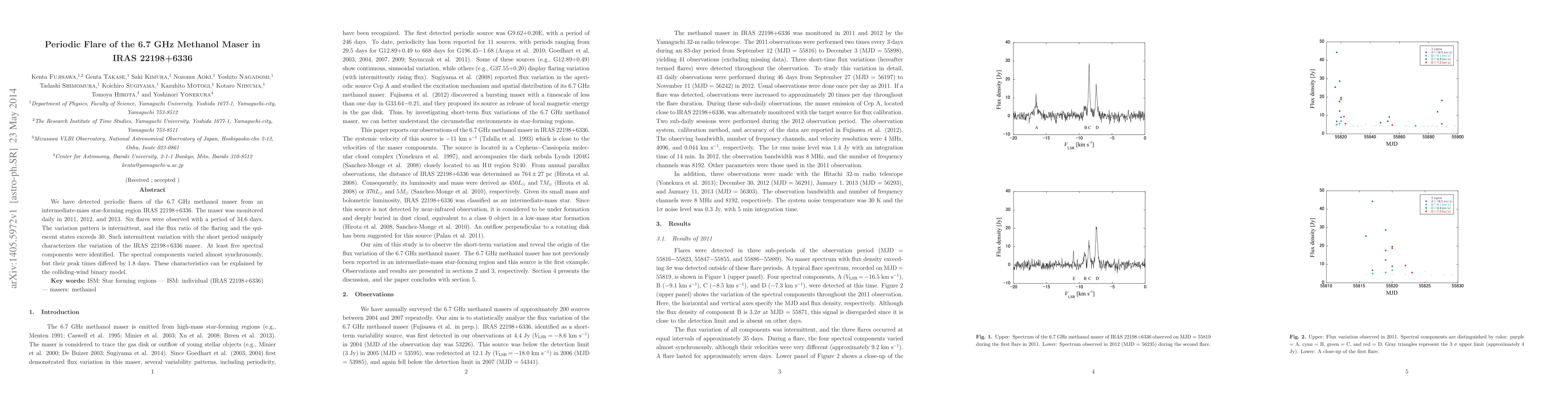 We have detected periodic flares of the 6.7 GHz methanol maser from an intermediate-mass star-forming region IRAS22198+6336. The maser was monitored daily in 2011, 2012, and 2013. Six flares were observed with a period of 34.6 days. The variation pattern is intermittent, and the flux ratio of the flaring and the quiescent states exceeds 30. Such intermittent variation with the short period uniquely characterizes the variation of the IRAS22198+6336 maser. At least five spectral components were identified. The spectral components varied almost synchronously, but their peak times differed by 1.8 days. These characteristics can be explained by the colliding-wind binary model.