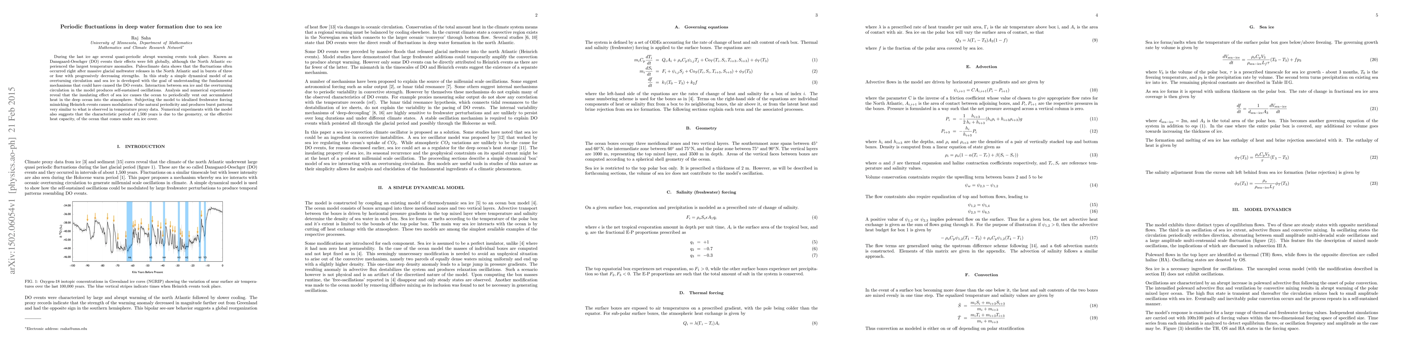 During the last ice age several quasi-periodic abrupt warming events took place. Known as Dansgaard-Oeschger (DO) events their effects were felt globally, although the North Atlantic experienced the largest temperature anomalies. Paleoclimate data shows that the fluctuations often occurred right after massive glacial meltwater releases in the North Atlantic and in bursts of three or four with progressively decreasing strengths. In this study a simple dynamical model of an overturning circulation and sea ice is developed with the goal of understanding the fundamental mechanisms that could have caused the DO events. Interaction between sea ice and the overturning circulation in the model produces self-sustained oscillations. Analysis and numerical experiments reveal that the insulating effect of sea ice causes the ocean to periodically vent out accumulated heat in the deep ocean into the atmosphere. Subjecting the model to idealized freshwater forcing mimicking Heinrich events causes modulation of the natural periodicity and produces burst patterns very similar to what is observed in temperature proxy data. Numerical experiments with the model also suggests that the characteristic period of 1,500 years is due to the geometry, or the effective heat capacity, of the ocean that comes under sea ice cover.