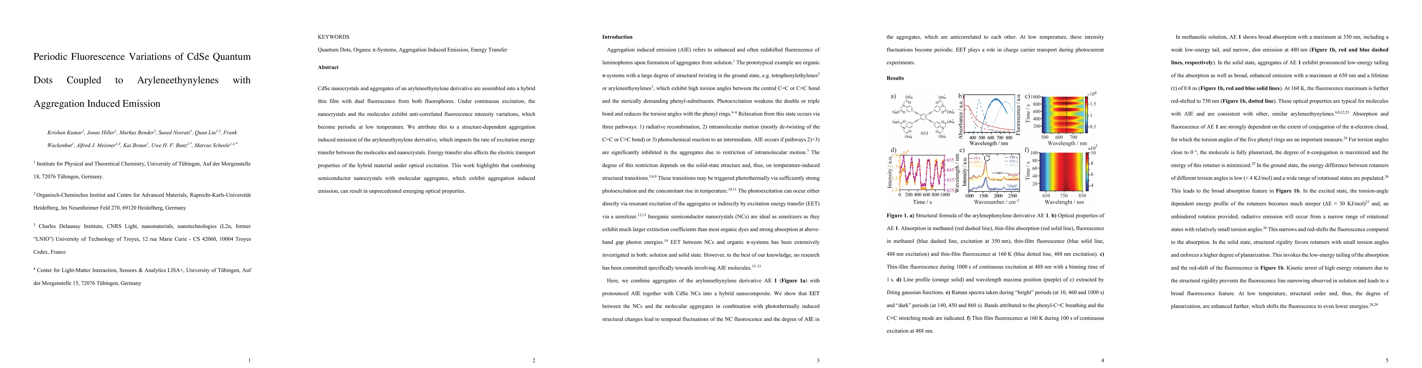CdSe nanocrystals and aggregates of an aryleneethynylene derivative are assembled into a hybrid thin film with dual fluorescence from both fluorophores. Under continuous excitation, the nanocrystals and the molecules exhibit anti-correlated fluorescence intensity variations, which become periodic at low temperature. We attribute this to a structure-dependent aggregation induced emission of the aryleneethynylene derivative, which impacts the rate of excitation energy transfer between the molecules and nanocrystals. Energy transfer also affects the electric transport properties of the hybrid material under optical excitation. This work highlights that combining semiconductor nanocrystals with molecular aggregates, which exhibit aggregation induced emission, can result in unprecedented emerging optical properties.